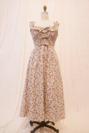 Your friend in the Aida dress knows exactly where to forage for wild blueberries! The quality cotton of this beautiful beige midi sundress is specked with blue, sage, and lavendar florals. The elasticated ruffled flutter straps can be worn on- or off-the-shoulder, and the fully elasticated bodice provides comfort that moves with you. Three ample bows decorate the front of the bodice. The full skirt with hidden pockets tumbles away from the body at the natural waist.
