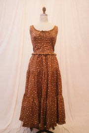Perfect your pie crust recipe in the Ainsling Set, in a darling brown frabric speckled with a dainty yellow, pink, and green ditsy floral print. This two-piece set comes with a semi cropped blouse with thick straps perfect for hiding bra straps, and a ribbon bow that threads in and out of the needle-point style neckline to tie at the center of the bust. It has vertical pleated detailing along the bodice with functional hook and eye clasps down the center of the top. Smocked sides ensure a comfy, custom fit, and the bottom ruffle gives the subtlest nod to a peplum. The skirt features hidden pockets and an elasticated waistband that ties at the center of the waist and generous tiers, for a cascading vintage effect finished with an eyelet ruffle flourish at the bottom hem. Style with an oversized tote and a messy updo for a romantic summer day look.