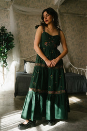 A dress full of dreams, the Amoret Dress comes in a dreamy hunter green hue and is decorated in the most romantic pink, light green and orange embroidered floral print. This maxi sundress has adjustable bow tie straps, a subtle scoop neckline, raised waistline and a romantic tiered skirt that is decorative in embroidery and ruffle details. Style with a cardigan, lace up winter booties and an oversized basket bag for a dressed up yet comfortable winter look.