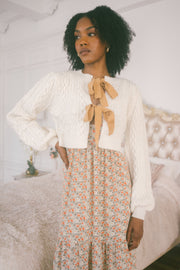 A timeless piece, the Audrey cardigan comes in a soft eggshell cream hue, with two oversized light brown bows down the center that tie the sides together. In a semi-cropped cut, this piece has a high scoop neckline and long sleeves that cinch at the wrist, creating a romantic ballon sleeve look. Finished off with a soft cable knit stitch scattered throughout, style this beauty with a floral midi dress, lace up fall booties, an oversized wicker bag and a dash of lipstick for the perfect pumpkin patch look.