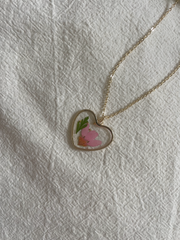 This delicate gold heart necklace features dried flowers set in clear acrylic with a gold border. Natural and sweet vintage design with pink flowers, green leaves and bead accents.