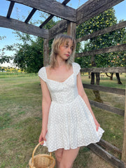 Everyone needs a white eyelet dress for summer and the Aurliea Dress is the perfect piece for twirling around in golden hour evenings. In a romantic babydoll mini length, the piece has a raised waistline with vertical corset-style boning along the waist. It has short puff sleeves, outlined bust details and functional buttons along the bodice. The piece is fully lined with a fitted waist and flowy mini length tiered skirt. Style with an oversized sunhat, vintage slides and a dash of lipstick.