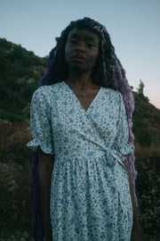 Everyone loves an adjustable wrap dress and the Barrie Dress is the quintessential beauty for all of your everyday needs. In an off-white hue, this dress is scattered in a baby blue ditsy floral print with quarter length puff sleeves that cinch at the cuff. It has a raised waistline with an adjustable wrap on the left side of the waist that ties together in an oversized bow. Finished off in a pretty midi length romantic hemline, style this everyday dress with a sunhat, lace up fall booties and a chunky cardigan.