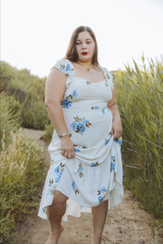 A timeless design, the Bijou Dress comes in a off-white hue and is scattered with a royal blue and green floral print. This pretty piece has short flutter sleeves, a raised waistline and an open scoop neckline with a sutble v-neck design. In a romantic midi length, it has a semi flowly skirt with a mermaid hemline. Style with a dash of red lipstick, a messy updo and a basket bag for a feminine summer look.