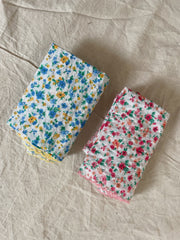 A sweet and dainty accessory to add any color pop to an outfit, the Brinn Scarf comes in two colors: one in an off-white with a pink lace trim and red, pink, orange and green flowers and another in off-white with a yellow trim scattered with blue, green and golden ditsy flowers.