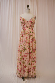 Romantic but with some edge, the Carlina dress is the definition of defiantly delicate. This spaghetti strap maxi sundress is patterned throughout with large pink and red roses atop a peachy base. The corset bodice features boning in the front for structure, and the open laced back is fully adjustable, for some snatched Renaissance drama. The light and flowly skirt features a thigh-high slit, adding a pinch of spice to the Carlina's sweetness.