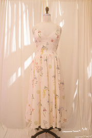 Perfect for days spent walking the streets of Italy, the Cecily Dress is a summers dream. In a cream hue, this vintage inspired beauty is covered in an oversized muted burgendy, yellow, blue and green floral print. This beauty has a v-neckline with a criss cross open back design. Feminine and flattering, the piece has a fitted waist with a romantic flowly midi length skirt and a slit of the left side of the silhouette. Style with a basket bag, vintage slides and a dash of lipstick for a timeless look.