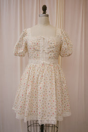 Take a turn around the May Pole in the Danica! This cream mini dress is speckled throughout with a delicate ditsy floral print in yellow, red, blue and sage. The romantic puff sleeves stay in place with comfy elastic, but the real star of the show is the intricate needle-point floral box lace detailing at the square neckline, natural waist, and bottom hem. The center of the bodice features three darling bows over dentelle lace. The fully smocked back bodice, hidden size zipper, and ample pockets make the Danica as functional as she is adorable, and ready to dance til midnight this Midsummer!