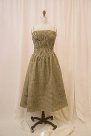 Like a heatwave during spooky season, the Delilah was made for L.A. autumn. This spaghetti strap midi sundress comes in a dark brown, cream, and mustard gingham print seersucker. The front of the bodice is fully smocked and features a basque waist. A hidden back zipper and adjustable spaghetti straps make the Delilah comfortable and easy to wear, and the hidden pockets are the perfect place for toting all your bits and bobs.