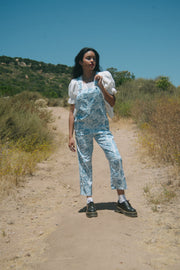In a sweet baby blue hue, the Eisley Overalls are scattered in an oversized romantic navy blue floral print. These overalls have adjustable buckled straps, a square neckline and a total of five pockets! The has an oversized hip with straight tapered fitting pants. Style with a romantic blouse, an oversized sunhat and a dash of red lipstick.