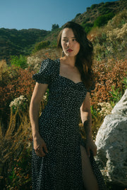 A darling classic beauty, the Evelyn Dress comes in a midnight black hue and is covered in a white ditsy daisy floral print. This midi dress has short puff sleeves, a raised waistline and and romantic sweetheart bust design. This beauty has a fitted waist with a romantic a-line midi length skirt with a slit on the left side of the leg. Style with an oversized basket bag, lace up booties and an oversized chunky knit cardigan for the dreamiest fall time look.