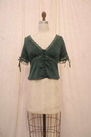 The Gemma blouse brings modern romance to your summer fling. This emerald green puff sleeve blouse feels silky to the touch. The v-neck is adorned with matching green lace that continues under the bust for a subtle peek-a-boo effect. The short sleeves are also finished with green lace and functional ties that can be cinched in for an optional puff-sleeve shape. A row of fabricated buttons down the front of the blouse form a button down closure that oozes old-world charm. Dress the Gemma up with vintage slacks and a red lip for a night of smooth jazz and sweet talk.