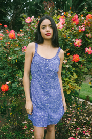 In a vibrant sea blue, the Gillian Dress is the perfect everyday piece for all of those sunny summer days. This mini sundress is scattered in an off-white and navy ditsy floral print with exaggerated ruffle detailing along the neckline and straps. The piece has an empire waistline with functional buttons along the front of the silhouette. Style with an oversized sunhat, a dash of blush and slides for a timeless summertime look.