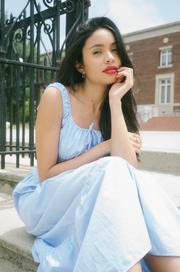 Nothing says spring quite baby blue striped midi dress and the Gretal Dress is the dreamiest addition to any spring lovers closet. In a baby blue and off-white hue with vertical picnic-inspired stripes, this midi sundress has functional buttons along the bodice with a square neckline and fabric gathering along the bust. It has a corset-like center with smocking along the back and a pretty tiered midi length skirt. Finished off with a pretty bow detail on the neckline, style this classic beauty with a dash of red lipstick, an oversized sunhat and a basket bag for the perfect spring farmers market look.