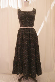 An Astrior favorite, the Hailey Set comes in black fabric that is dusted with a Nordic ditsy floral print in soft blue, red and yellow. The set includes a semi-cropped blouse with a square neckline, thick straps for sleeves, and an oversized bow in the center of the neckline that weaves in and out of the top of the blouse. It has vertical pleated detailing along the bodice with functional clasps down the center of the blouse. The skirt is decorated with fabric gathering details along the waistband and tiers, creating an extra flowy, vintage-inspired look. Finished off with an adjustable waist that ties together in an oversized bow, this set can be styled with your go-to slides, an oversized tote and a messy updo for a romantic day to night look.