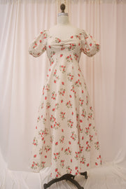 Sweet as pie, the Haromie Dress comes in an earthy cream with an oversized strawberry fruit and blossom print dotted with red, green, and a touch of yellow. This midi dress has short puff sleeves, with a sweetheart neckline and empire waist. This piece has pockets and a smocked back (making it stretchy and versatile). Perfect for berry-picking with your berry-favorite person.