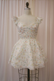 Step into summer with the Ilona Dress! This feminine beauty comes in a pretty cream hue and is decorated in pastel yellows, orange, blue and pink ditsy florals. The piece has short layered flutter sleeves, a subtle v-neckline and a sweetheart bust. It has a fully smocked waist / bodice around the front and the back, making it extra stretchy and roomy for a variety of different shapes and sizes. It has a romantic tiered mini length skirt that is decorated with lace details along the layers. Style with a dash of lipstick, summer slides and an oversized sunhat for a picturesque picnic look.