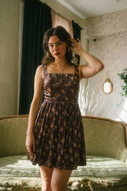 A pretty little velvet beauty, the Jezebel Dress comes in a chocolate brown hue and is scattered in a muted soft gold, orange and cream ditsy floral print. This babydoll midi sundress has a square neckline, raised waistline and pretty vertical corset detailing along the center of the bodice. The piece has fabric gathering around the waist with a romantic, flowly mini length skirt. Style with tights, an oversized chunky cardigan and a dash of lipstick for a timeless holiday look.