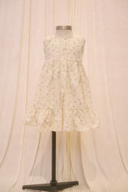 The Mira sundress comes in a light cream fabric with a dusty red and blue ditsy floral print. The button down column dress features decorative embroidered details at the bodice and down the center, and the functional buttons are made with a flower design The bottom hem boasts a tier for a little extra bounce!