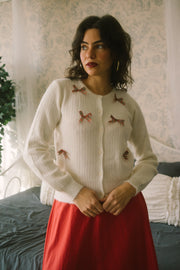 A timeless vintage inspired beauty, the Lili Cardigan comes in a pretty off-white hue and is decorated with pretty tartan printed bow embellishment details scattered throughout the front of the bodice. It has a scoop neckline, functional buttons along the front of the bodice and long sleeves. The bows are covered in red, cream and green, giving it that extra holiday festive cheer. Style this with your favorite holiday dress, lace up winter booties and a dash of lipstick.