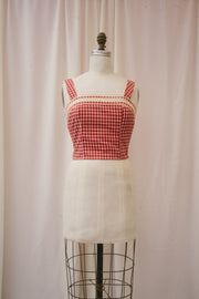 If you liked our Liorael dress, wait til you see her as a blouse! This darling cropped tank top comes in a deep red and buttery cream allover gingham print. The gently curved neckline of the bodice is decorated with a crochet lace panel that is threaded through with a delicate cream ribbon that ties in a decorative mini bow at the center bust. The decorative panel features delicate scalloped trip on top and bottom that continues on both sides of the straps. Two subtle darts give the front of the bodice structure, and the hidden side zipper and smocked back0-panel mean you don't have to style for comfort and ease.