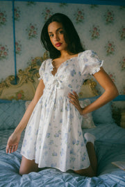 Comfortable and beautiful, the Luzia Dress comes in a pretty off-white hue and is covered in a baby blue and sage green ditsy rosy floral print. This babydoll mini dress has exaggerated short puff sleeves, a deep v-neckline with ruffle detailing along the sleeves and down the neckline. The piece has a raised waistline with a fitted waist and fabric gathering along the waistline that flows out into an adorable mini length skirt. It has an elasticated waistband along the back with an oversized bow that ties the sleeves together along the upper back. Finished off with a semi-open back that's perfect for transitioning from winter to spring, style with tights, lace up winter booties and a lightweight knit for a darling wintertime look.