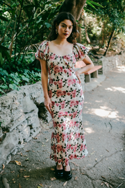 An ethereal beauty, the Mariah Dress comes in a cream hue and is covered in an oversized dusty rose, forest green and blush pink rosy floral print. This maxi slip dress is the perfect dreamy piece for all of those upcoming fall / holiday parties! The piece has exaggerated short puff sleeves, a scoop neckline and an empire waistline with fabric gathering details along the bust. It has a pretty, slip dress style silhouette with a petite flare at the hemline. Style with black slides / Mary Jane's, an oversized basket bag and a dash of lipstick for the perfect party look.