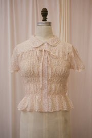 The Meadow blouse is a gauzy daydream in a semi-sheer muted pastel pink fabric flecked with the tiniest purple, blue and sage florals. The Peter Pan collar and floaty cap sleeves feature a delicate dentelle lace border. The fully elasticated bodice is designed to create visual movement and maxiumum comfort, while the functional buttons and ribbon tie mean this blouse can be styled in a number of versatile ways. Style with a deep red pout for a dreamy, boudoir photoshoot moment.