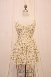 Like a sweet summer love song, the Mindy Dress is a breathe of fresh air. This babydoll mini sundress comes with a cream base hue and is covered in a blue and green oversized floral print. The piece is decorated with cream lace trimming along the neckline, hemline and in vertical pannel corset detailing down the bodice. The piece has a pretty scoop basque waistline and a corset-esc bust detail with wiring underneath the bust and fabric gathering across it. Style this pretty babe with an oversized sunhat, espadrilles and a dash of blush!