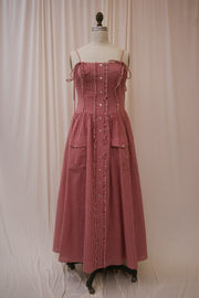 Every inch of the Nina dress is just darling! This maxi length red gingham sundress features delicate spaghetti straps decorated with dainty bows at both the front and back of the bodice. Functional heart-shaped mother-of-pearl buttons sit atop an ample middle ruffle that runs from top to bottom of the dress, and the square neck bodice is flanked with frills on either side. The two functional flap pockets at the front of the skirt are large enough for your phone, and finished with buttons so you can leave your purse at home. The a-line skirt falls from the natural waist with just the right amount of volume. The back is fully adjustable, with a central zipper, elasticated waist, and smocked bodice.