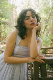 Inspired by long summer days on the prairie, the Noeline Dress comes in a solid muted soft blue hue and is scattered in a solid floral eyelet print. This maxi sundress has a square neckline, empire waistline and romantic maxi length skirt with a mermaid hemline. The piece has scalloped lace trimming along the neckline and straps, with an open back that ties together in an oversized bow along the mid back of the dress. This piece tends to run on the bigger side, with a fully elasticated waist along the back, adjustable straps and an adjustable bow. We recommend sizing down!
