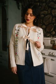If you know Astrior you know we are a sucker for floral embroidery, especially on cardigans! In a cream hue, this cardigan is decorated with red, purple, green and blue embroidered flowers on both sides of the silhouette. It has long sleeves with vintage inspired cable knit stitching scattered throughout. It's tied together with two oversized cream bows in the center, creating an extra romantic, coquette look. Style with your favorite dress or a simple jeans and tee combo, this cardigan is perfect for any occasion!