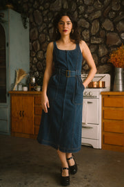 Everyone needs a classic denim dress and the Ophelia Dress is the perfect winter to spring transition piece. In a solid dark wash denim hue, this midi sundress has a square neckline raised waistline and two oversized pockets on both sides of the hip. The piece has a functional zipper that zips all the way from the top to the bottom, with vertical pannel detailing on both sides of the silhouette. It has belt loops along the waist that buckles together with an oversized matching belt along the waistline. Style this timeless nineties inspired beauty with Mary Janes, an oversized cardigan and a dash of lipstick.