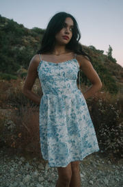 In a print reminisent of the English countryside, the Ottalie Dress comes in a pretty off-white hue and is scattered in a sky blue oversized floral print. This mini sundress has adjustable tie straps, a pretty scoop neckline and exaggerated ruffle detailing along the neckline and mermaid hemline. The piece has a raised waistline with a semi smocked backside and a fit and flare silhouette with a tailored waist and a flowly skirt. Style with lace up fall booties, a dash of lipstick and a lightweight cardigan.