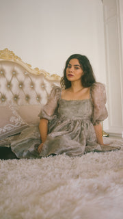 A darling, dainty and romantic piece, the Priscilla Dress comes in a pretty muted sage green hue and is scattered in a white and grey ditsy floral print. In a classic babydoll silhouette, it has long oversized puff sleeves, a square neckline and empire waistline. The piece is fully lined with a tulle accent (making it extra poofy and romantic!) It has scallop detailing along the sleeves, neckline and shoulders. Style with tights for cooler weather, the Antoinette Dress is sure to make an impression for all your winter festivities.