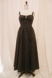 A classic dress you'll find yourself grativating towards for any and all occassions, the Regina Dress is an Astrior staple. In midnight black fabric patterned with delicate Nordic style florals, this midi sundress has adjustable buckled straps, a raised vintage-inspired basque waistline with vertical corset boning along the bodice. The gathered bust features an adjustable strap along the sweetheart milkmaid neckline that ties in an oversized bow in the center of the bust. This timeless beauty has a semi-smocked backside with fabric gathering along the waistline and a fully lined midi / maxi length skirt that features hidden pockets and a flirty slit over the left leg. Style with just about anything, this dress is the perfect winter to spring transition piece.