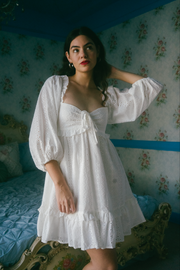 A sweet and simple beauty, the Sabina Dress is the ideal late winter to early spring piece. In a solid off-white hue, this mini babydoll dress is scattered in a timeless floral eyelet design, with a subtle v-neckline and ruffle detailing along the shoulders. This piece has quarter length puff sleeves, an empire waistline and a sweetheart cinched detail along the center of the bust. It's fully lined with a romantic mermaid mini length hemline. Style with a pop up color tights, lace up booties and an oversized basket bag for the most romantic late winter look.