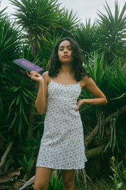 Step into the summer breeze with the Seraphine Dress. In an off-white hue, the piece is scattered in a baby blue and sage green ditsy floral print. This midi sundress has an empire waistline and a semi-open scoop back with an adjustable criss-cross corset back detail. The piece has a darling pink and green floral embellishment in the center of the bust and a straight fitting mini length skirt. Style with a lightweight cardigan, your favorite mary jane slides and a dash of lipstick.
