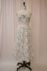Pretty as a present and cute as a cupcake, the Thistle dress is a summertime stunner. Festooned with a dreamy blue ribbon print that loops through pink floral sprays, this midi-length sundress features fully adjustable spaghetti straps and back zipper for easy wear. The sweetheart neckline is finished with a decorative scalloped loop border and a blue tie ribbon at the center. The basque waist and delicate vertical pleats on the bodice add romantic interest and structure to this girly delight of a dress.