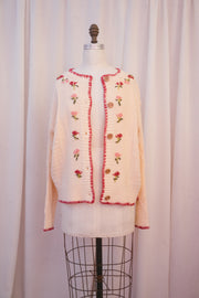 The Wicklow cardigan is snuggly soft in dreamy cream cable knit. Five oversized wood buttons run from the rounded neck to the stretchy, ribbed bottom hem at the hips. The front boasts two vertical rows of darling pink and red needlepoint flowers with green stems, and each of the hems is finished with rustic red top-stitching. The long sleeves and side panels feature varying knit patterns for texture and interest. And the best part--two hidden side pockets! Pair with an equally vibrant red lip and classic Mary Janes.