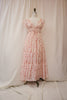 A modern ode to Victorian day dresses, the Ethyl Dress comes in a lustrous pale pink taffeta that is printed throughout with dusty rose floral sprays. The fabric is embossed with a physical floral print that adds texture and shine. This maxi sundress has short flutter sleeves, an empire waist, and a deep v-neckline that joins with two functional bows at the center of the bodice. Rouched fabric gathering along the bust and a fully elasticated double waist band make the Ethyl very stretchy and comfortable for a variety of shapes and sizes. This semi-sheer taffeta dress is fully lined, finished with a flouncy and romantic tiered skirt that stops just above the ankle. This beauty is the quintessential dream dress for all of your summer soirees.