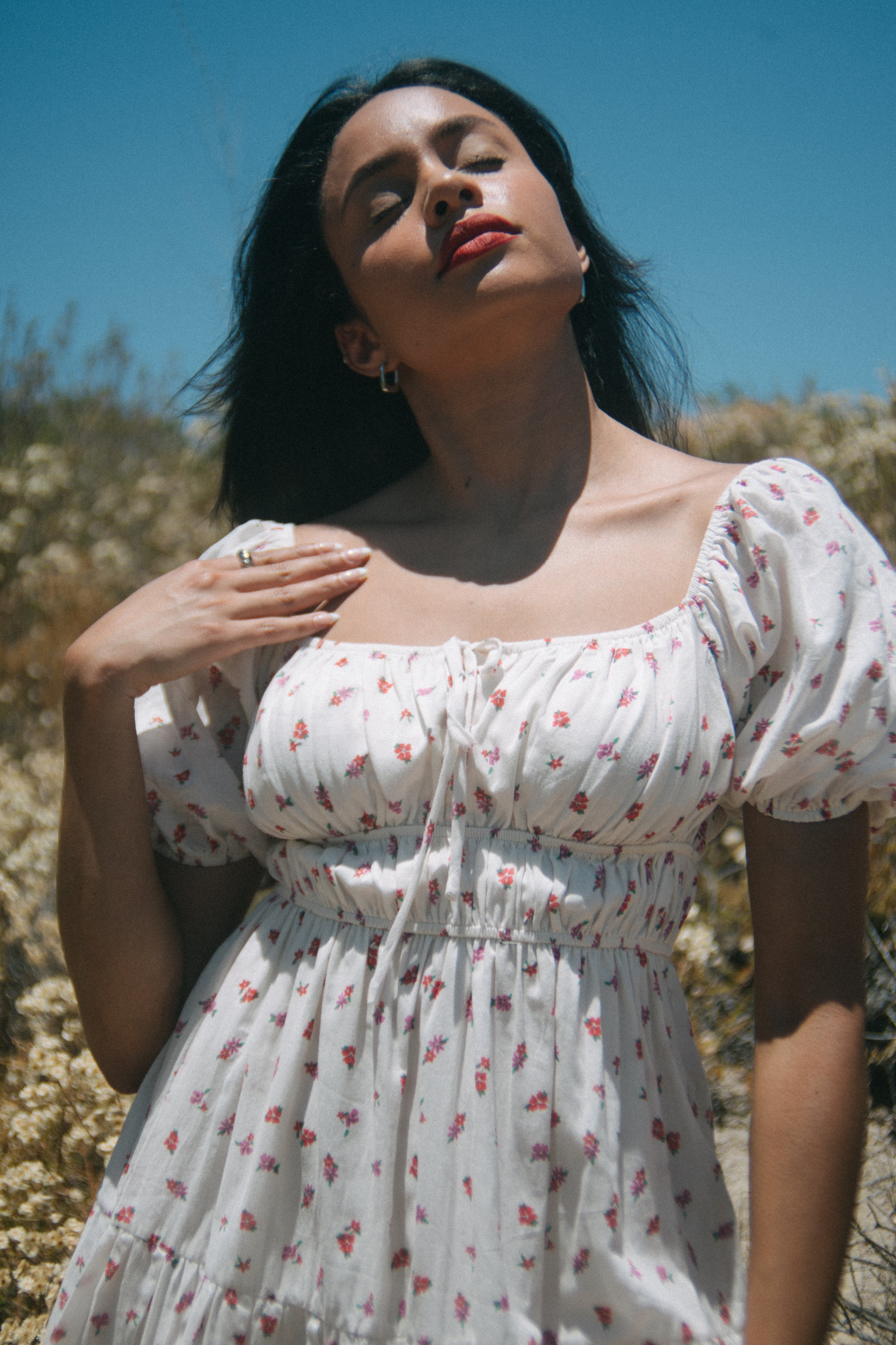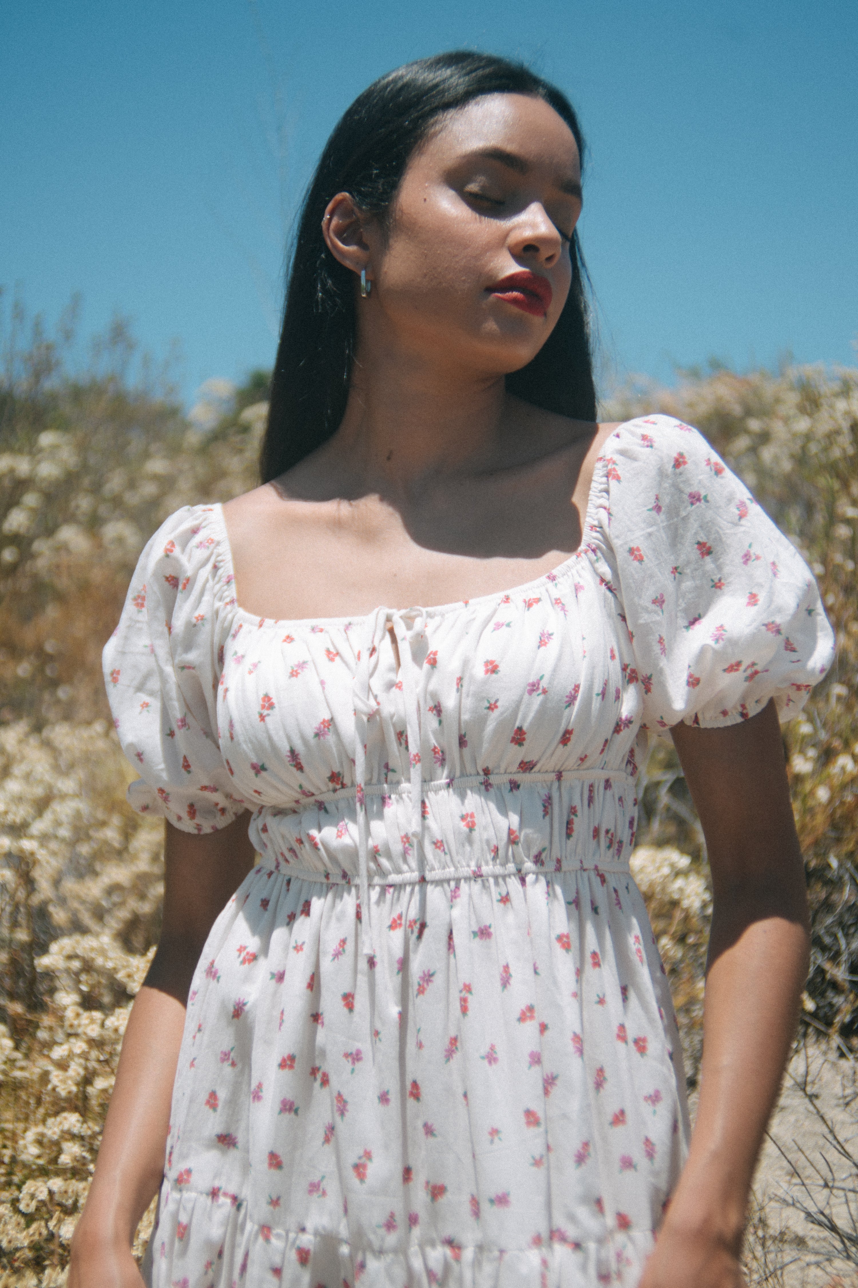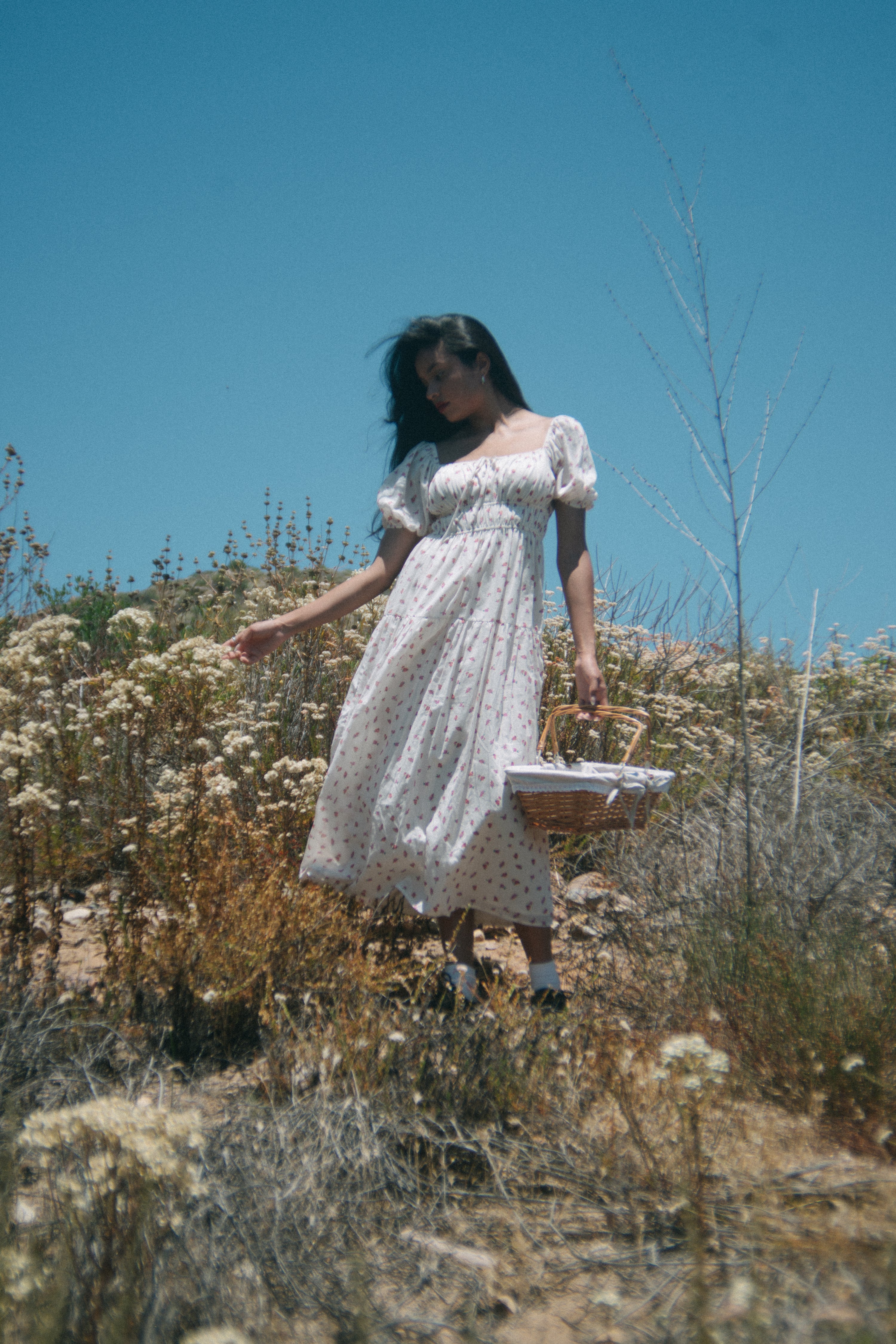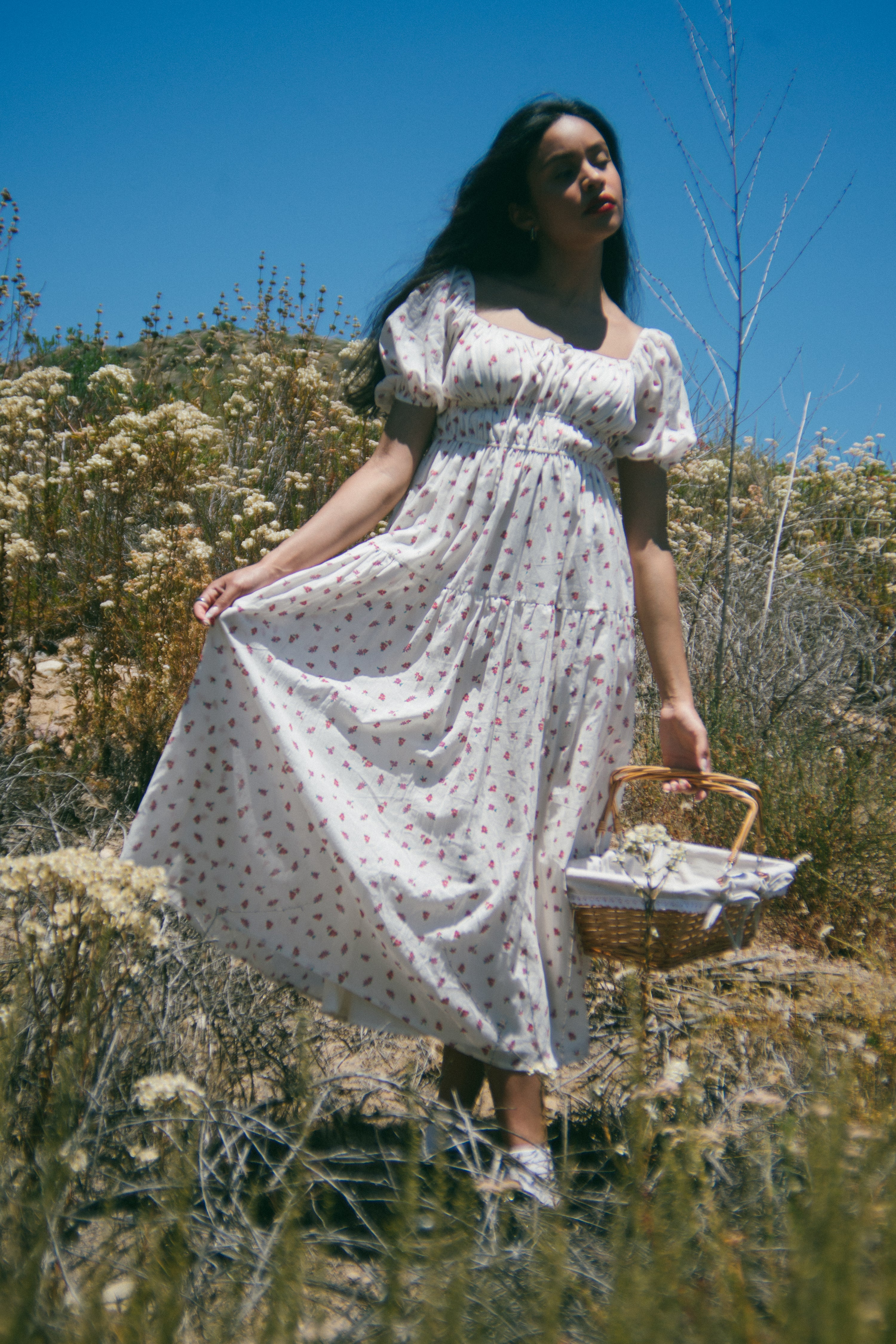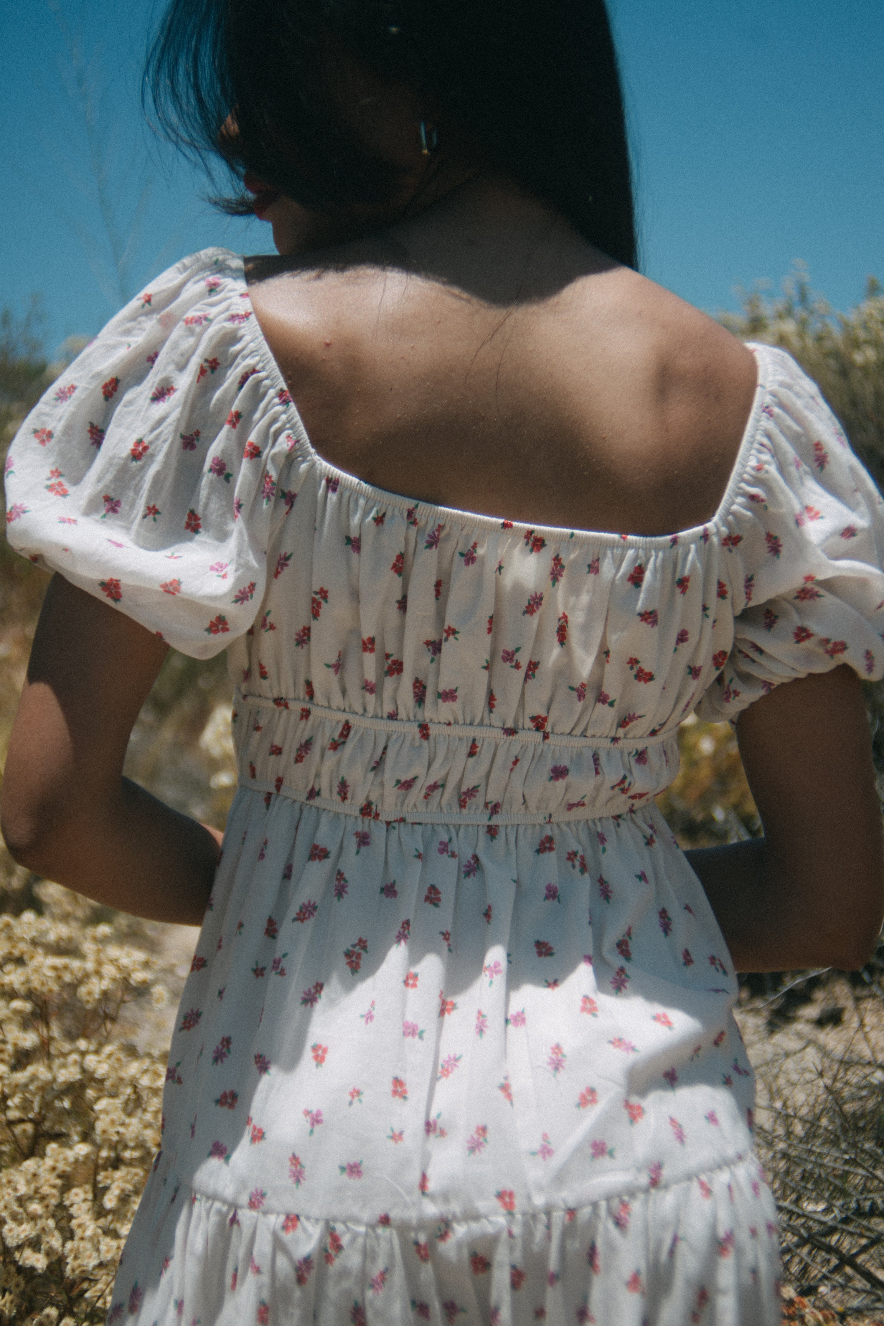 Inspired by romantic vintage day dresses, the Ingrid Dress comes in an off-white hue and is scattered in a pink, red and purple ditsy floral print. This midi dress has short puff sleeves, a square neckline and a raised waistline. It's fully smocked with an extremely stretchy and comfortable waistline. Finished off with a romantic tiered midi length skirt, style with an oversized basket bag, a dash of lipstick and summer sandals.