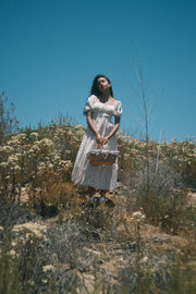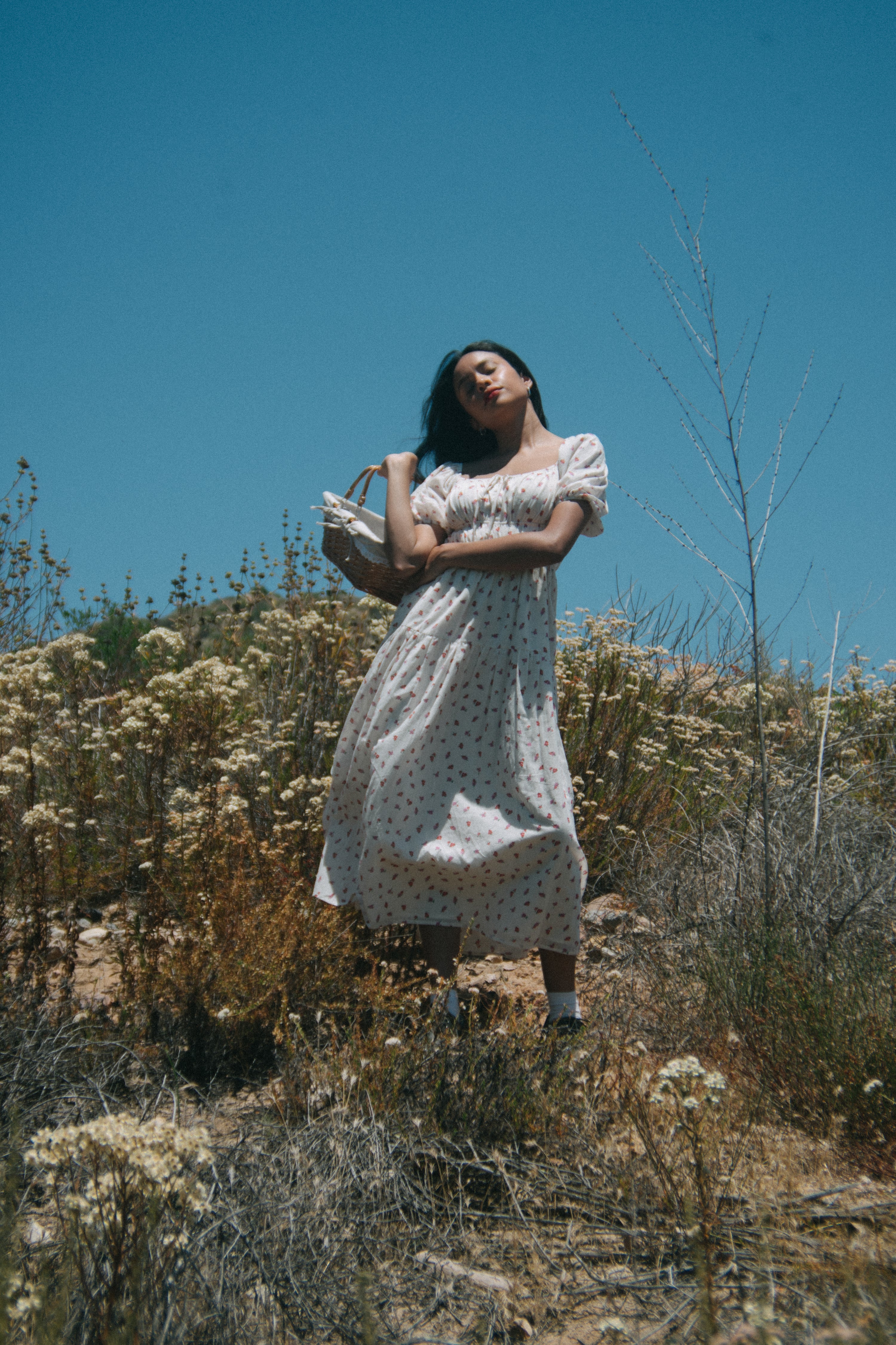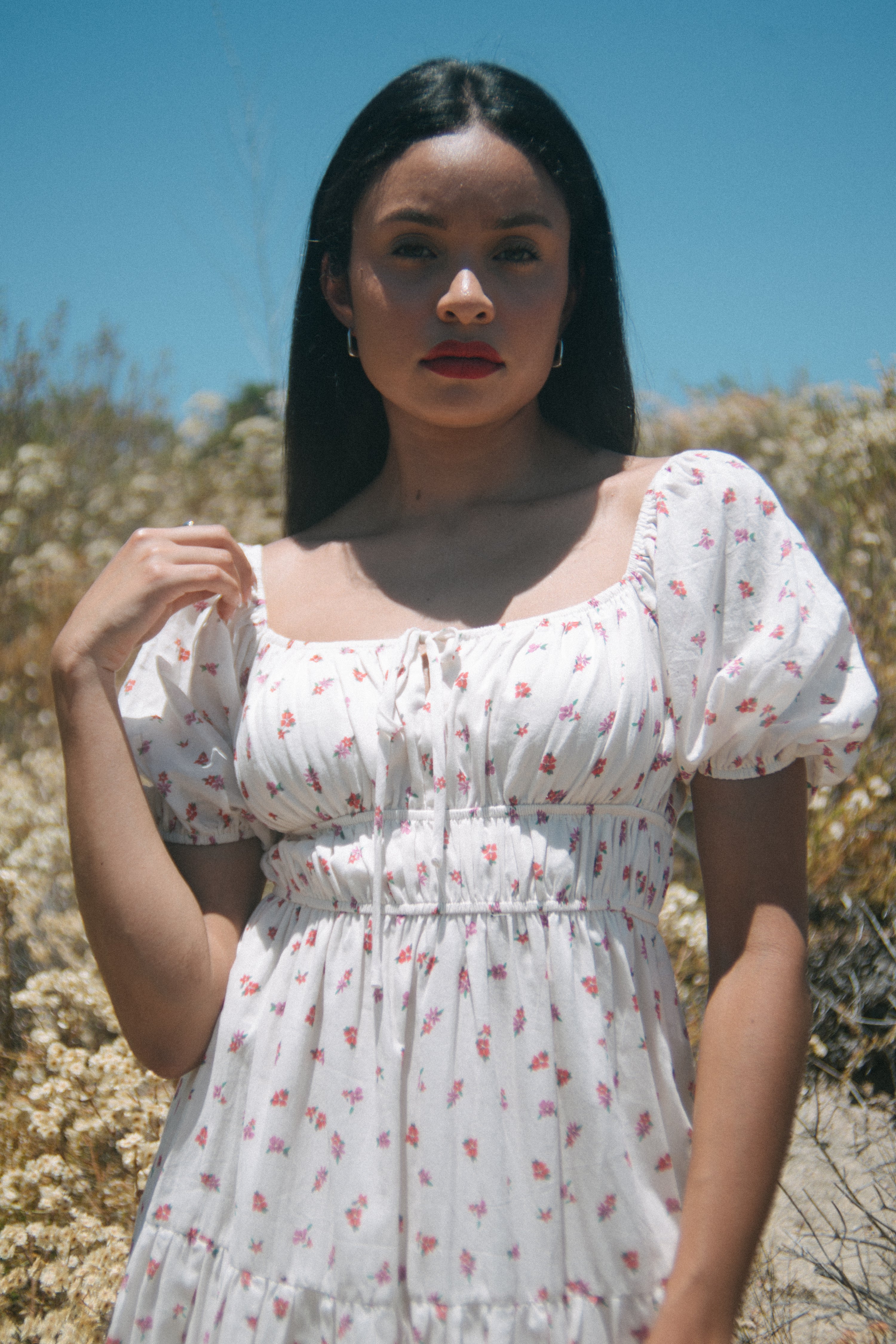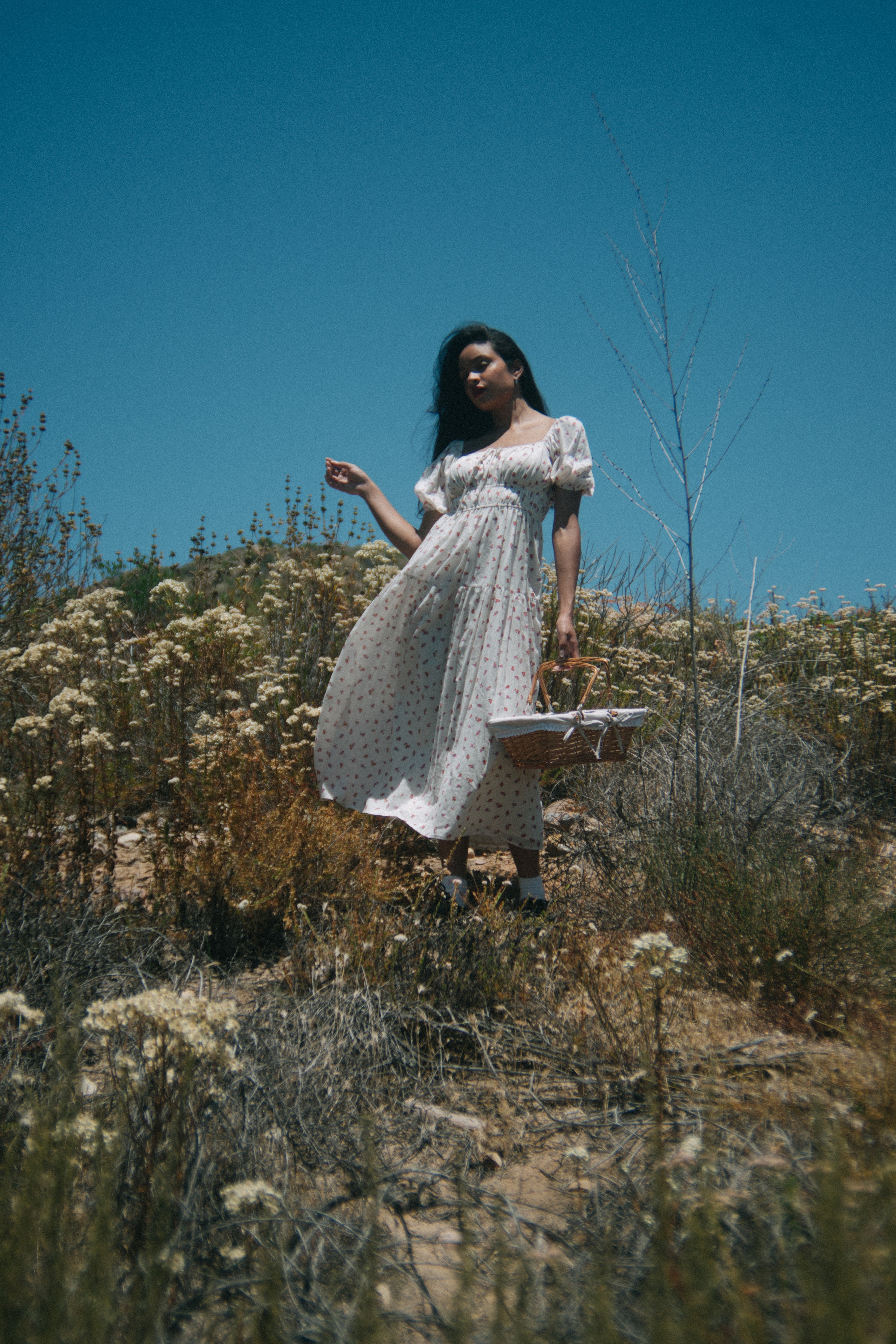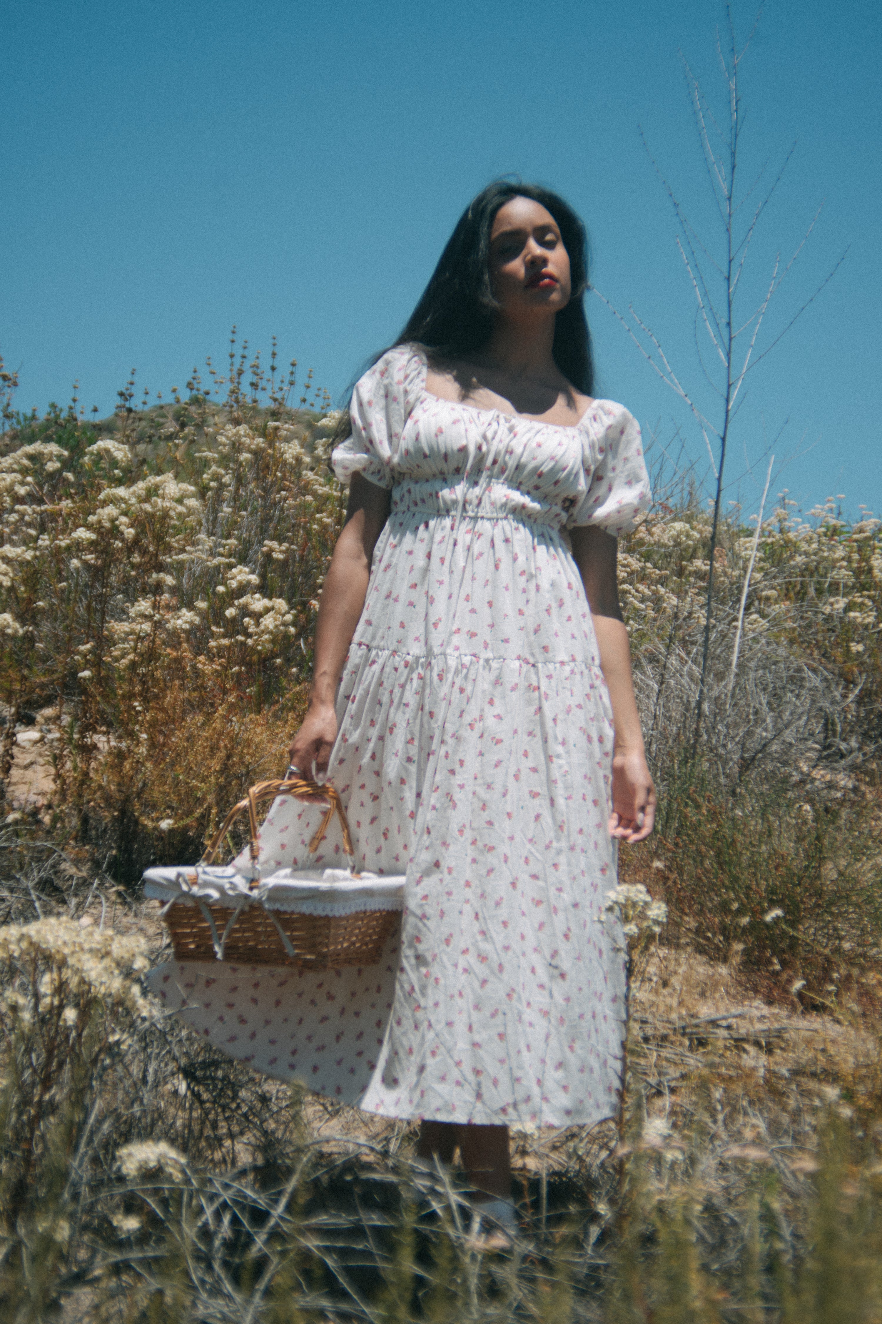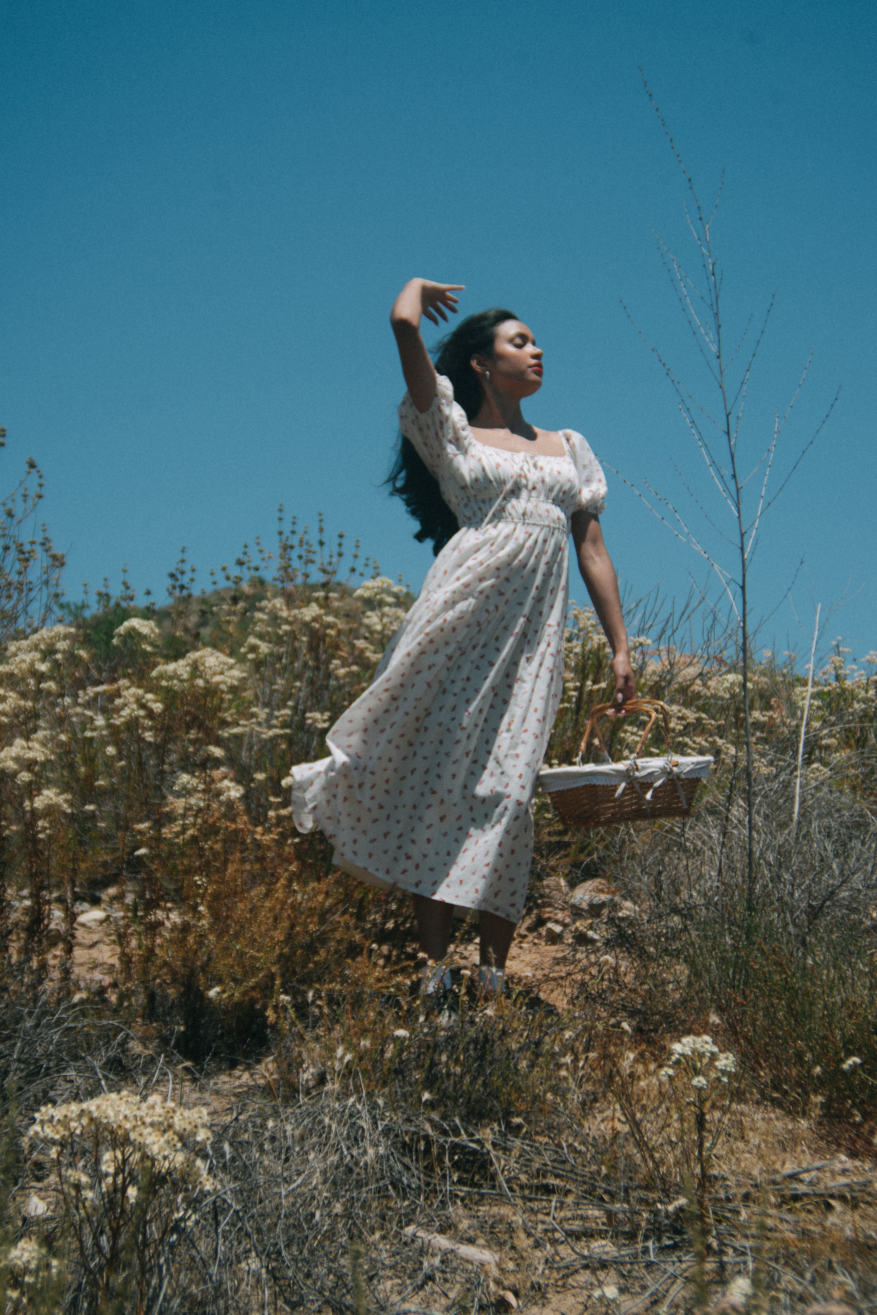 Inspired by romantic vintage day dresses, the Ingrid Dress comes in an off-white hue and is scattered in a pink, red and purple ditsy floral print. This midi dress has short puff sleeves, a square neckline and a raised waistline. It's fully smocked with an extremely stretchy and comfortable waistline. Finished off with a romantic tiered midi length skirt, style with an oversized basket bag, a dash of lipstick and summer sandals.