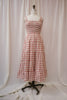 The Lizzy dress is as sweet as Neapolitan ice cream! This midi sundress comes in an allover brown and cream gingham print that features geometric pink chenille plaid embroidery lines for texture and color. The supremely stretchy bodice is fully smocked from the waist to the shoulder straps, which are thick enough to conceal a bra. Five decorative fabricated buttons adorn the center of the bodice. The skirt is fully lined, featuring five ample tiers for maximum flounce.