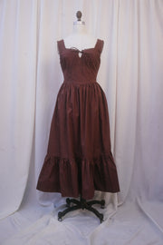 The fit of the Lallybroch dress is sweet as dessert. This sleeveless midi sundress comes in rich chocolate brown cotton. It features a square neckline that ties at the center bust with a bow, a romantic vintage-inspired basque waist, and micro-pleating across the bust for movement. The decorative brown lace trimming along the neckline and straps teamed with the delicate box lace vertical embroidery at the waist creates a subtle corset effect. The ample a-line skirt is fully lined with deep hidden pockets, and embellished with a generous bottom tier for extra volume. The back of the bodice is fully smocked for a custom, comfy fit. The thicker shoulder straps attach inside the back bodice with buttons, and can be adjusted for length or worn criss-crossed.