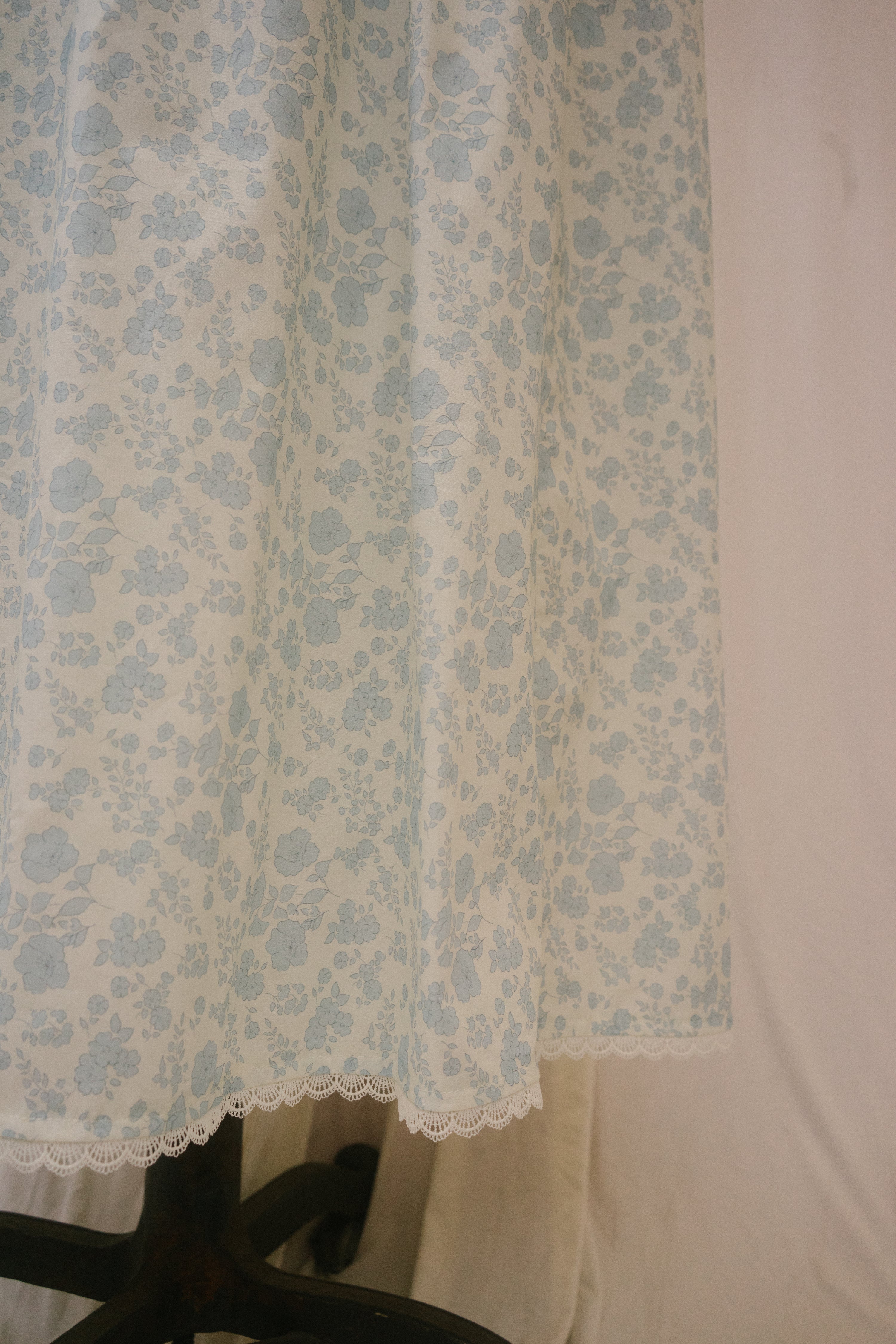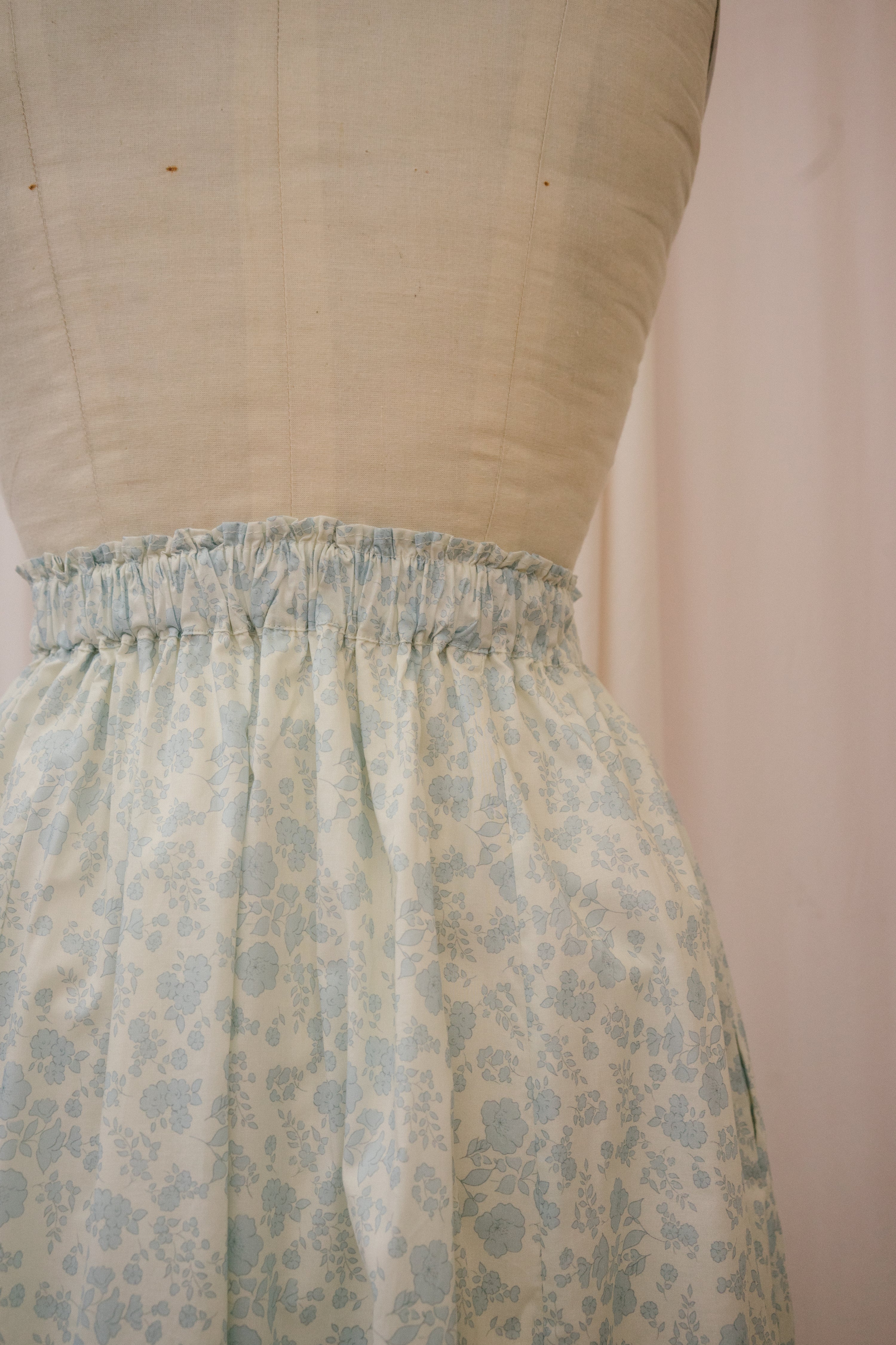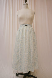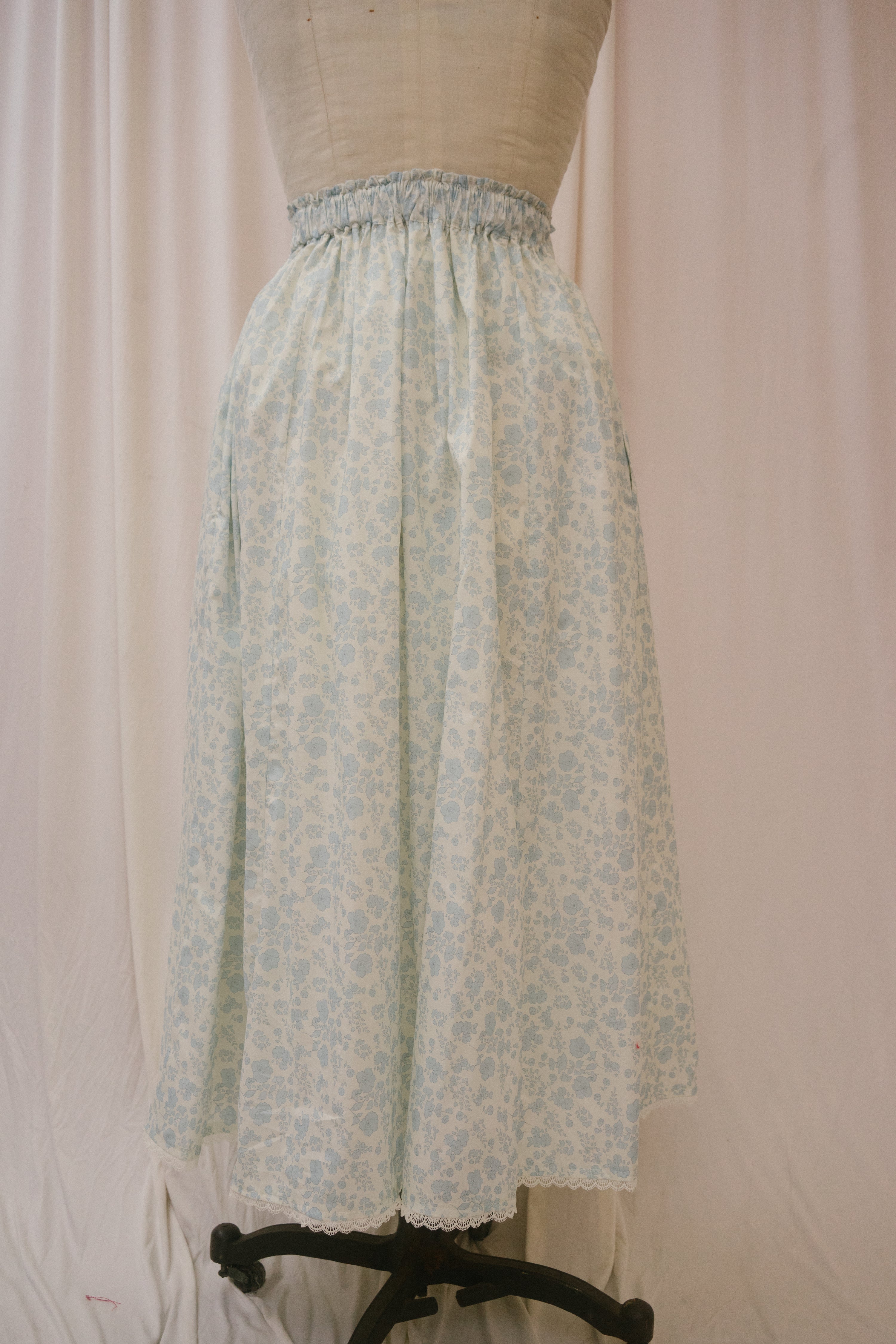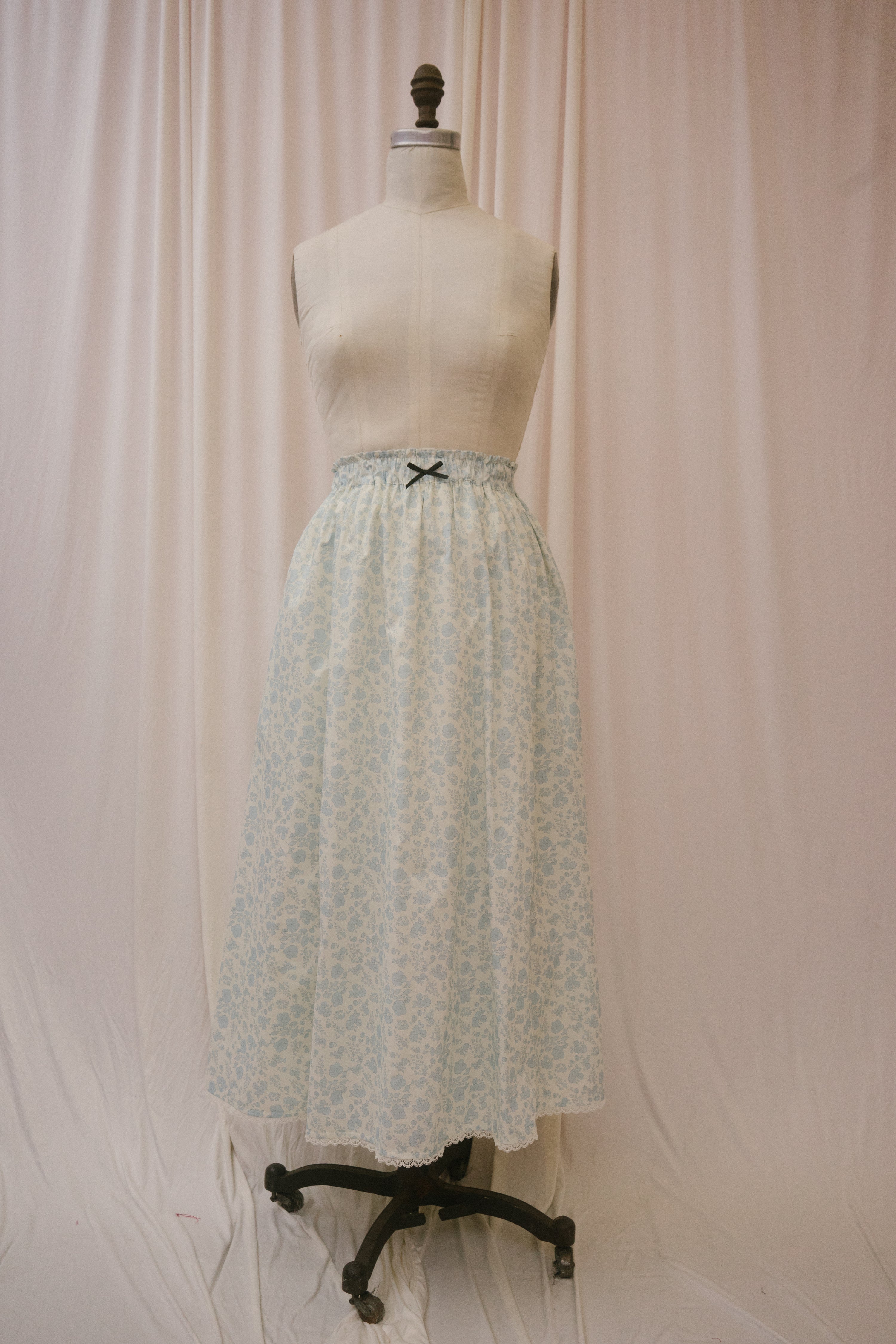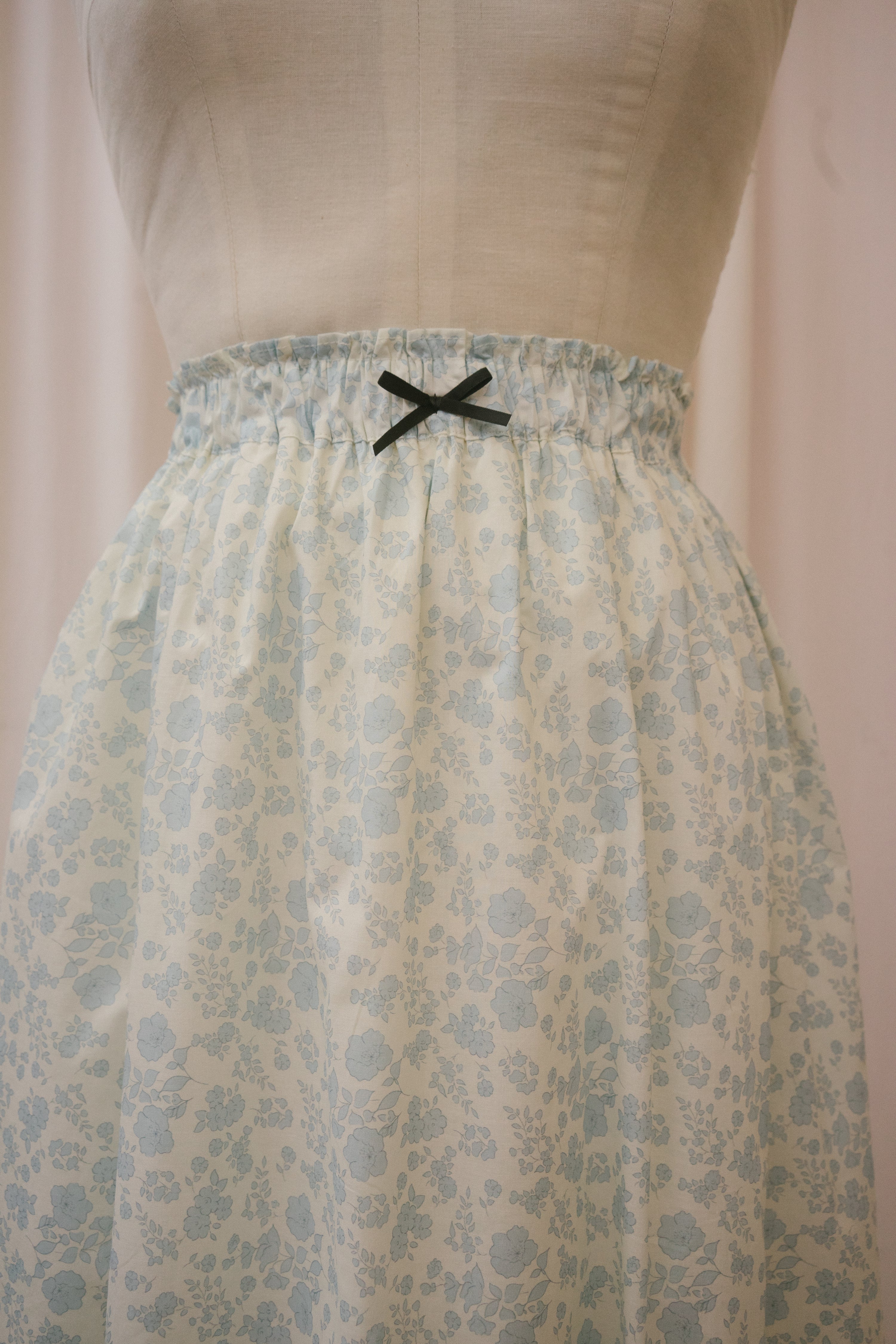 The Abruzzo skirt is the perfect summer layering piece. The breathable cream fabric of this a-line midi skirt is flecked with light blue ditzy florals, ideal for pairing with a light-wash denim vest or floaty chambray top. The elastic waist features an itty-bitty black bow in the front, making it easy to pair with black shoes or to power clash with a moody floral. Ample pockets are perfect for your bits and bobs, while the delicate dentelle lace at the bottom hem adds just a hint of vintage charm.