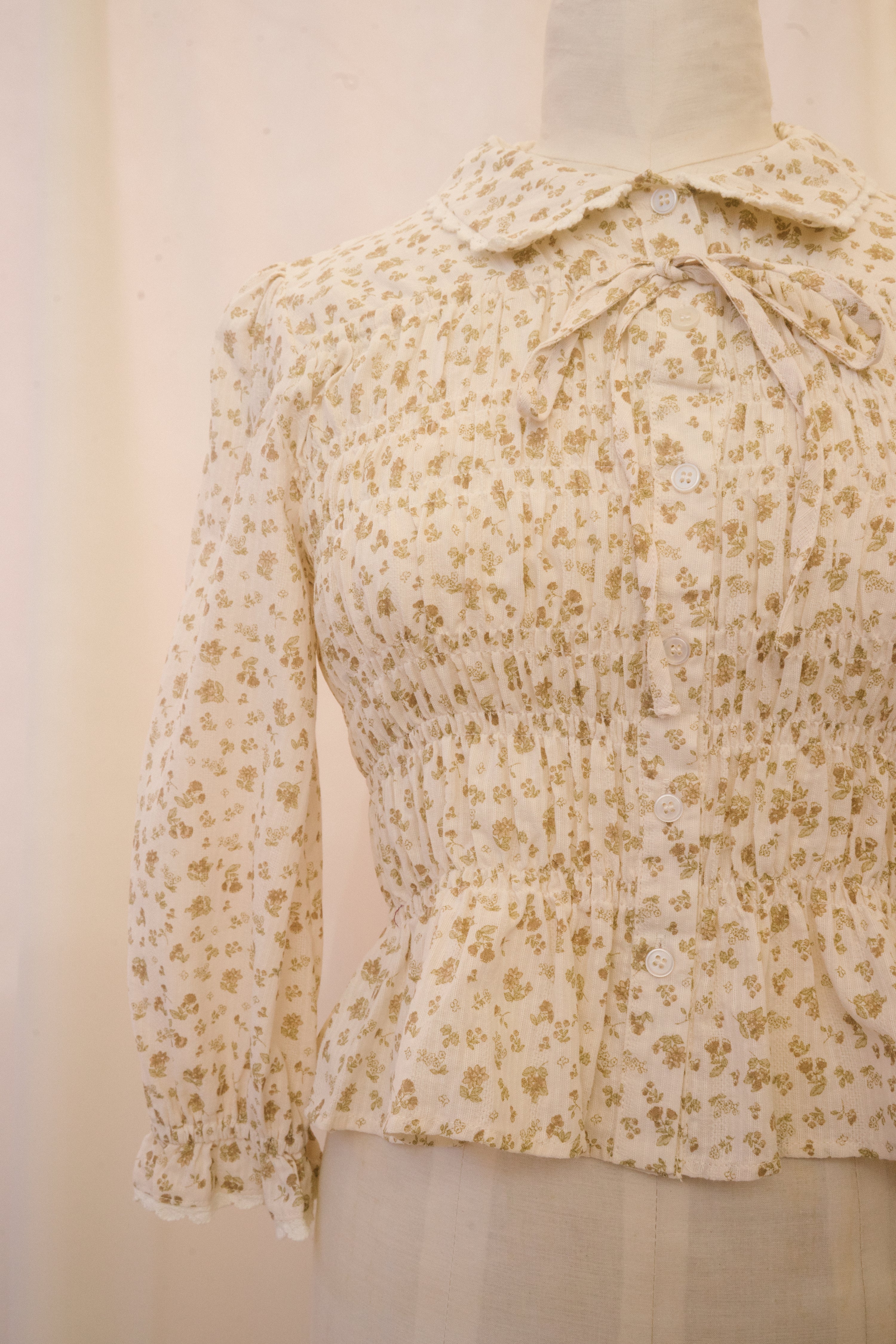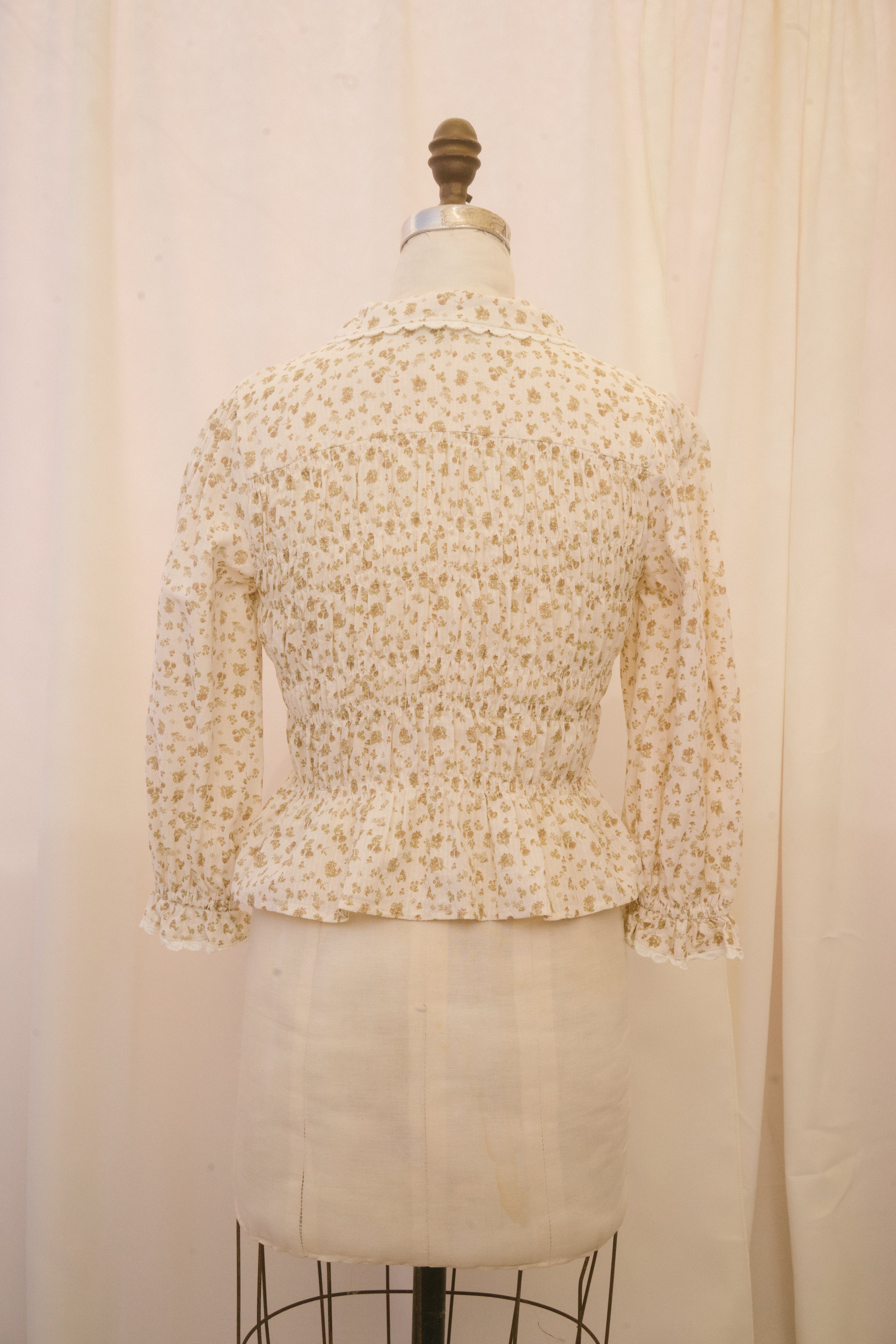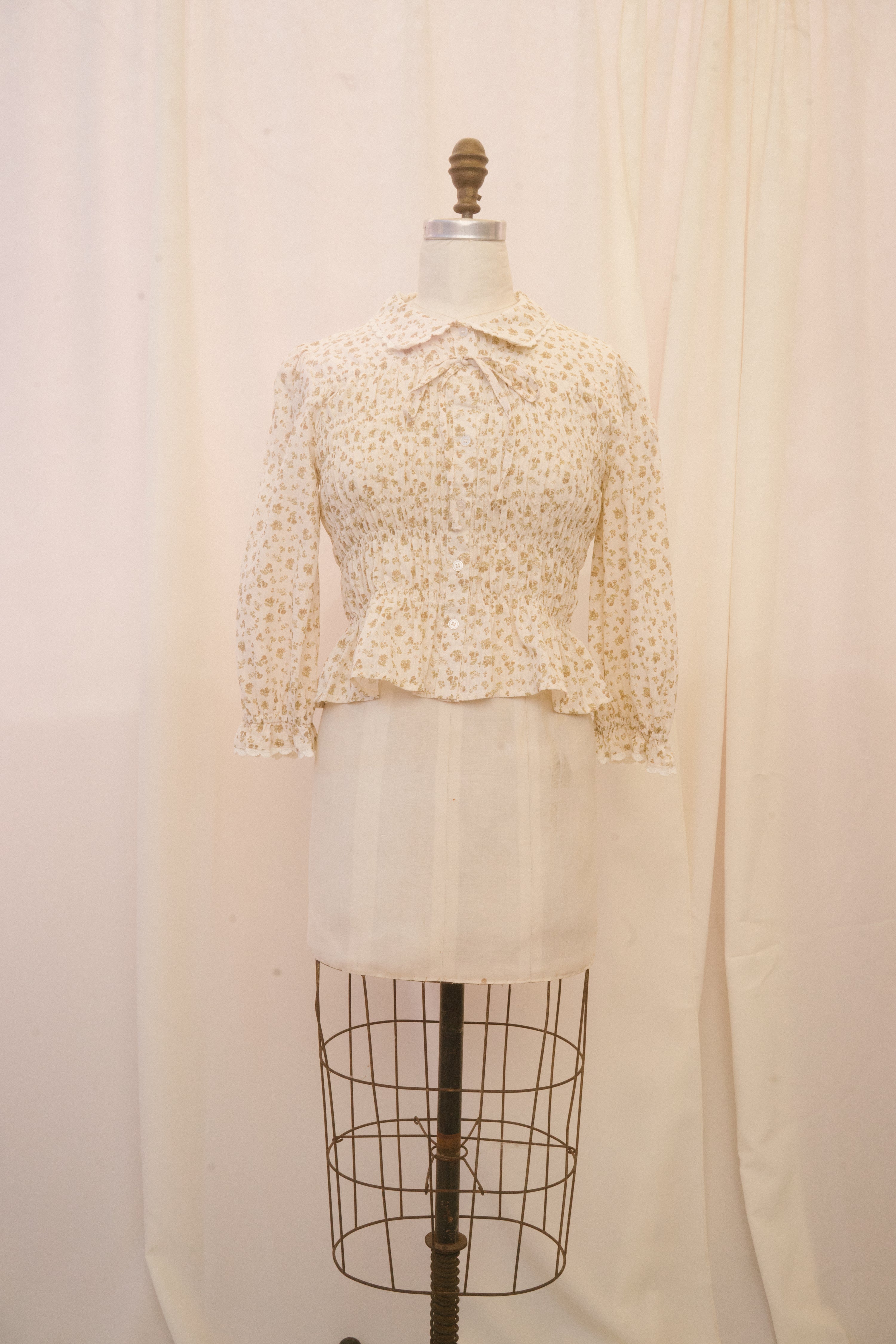 The Allegra blouse gives you buttoned-up elegance AND maxium comfort, which is why we named her "happy" in Italian! This collared blouse comes in a floaty cream fabric with brown florals printed throughout. The puffy sleeves are elasticated to hit mid-forearm and finished with cream scalloped dentelle embroidery. Five equally spaced elasticated horizontal bands give the bodice shape and structure that moves easily with you. Under the collar, which is also finished with the scalloped embroidery, hides a functional ribbon that can be tied in a pussy bow under the collar.