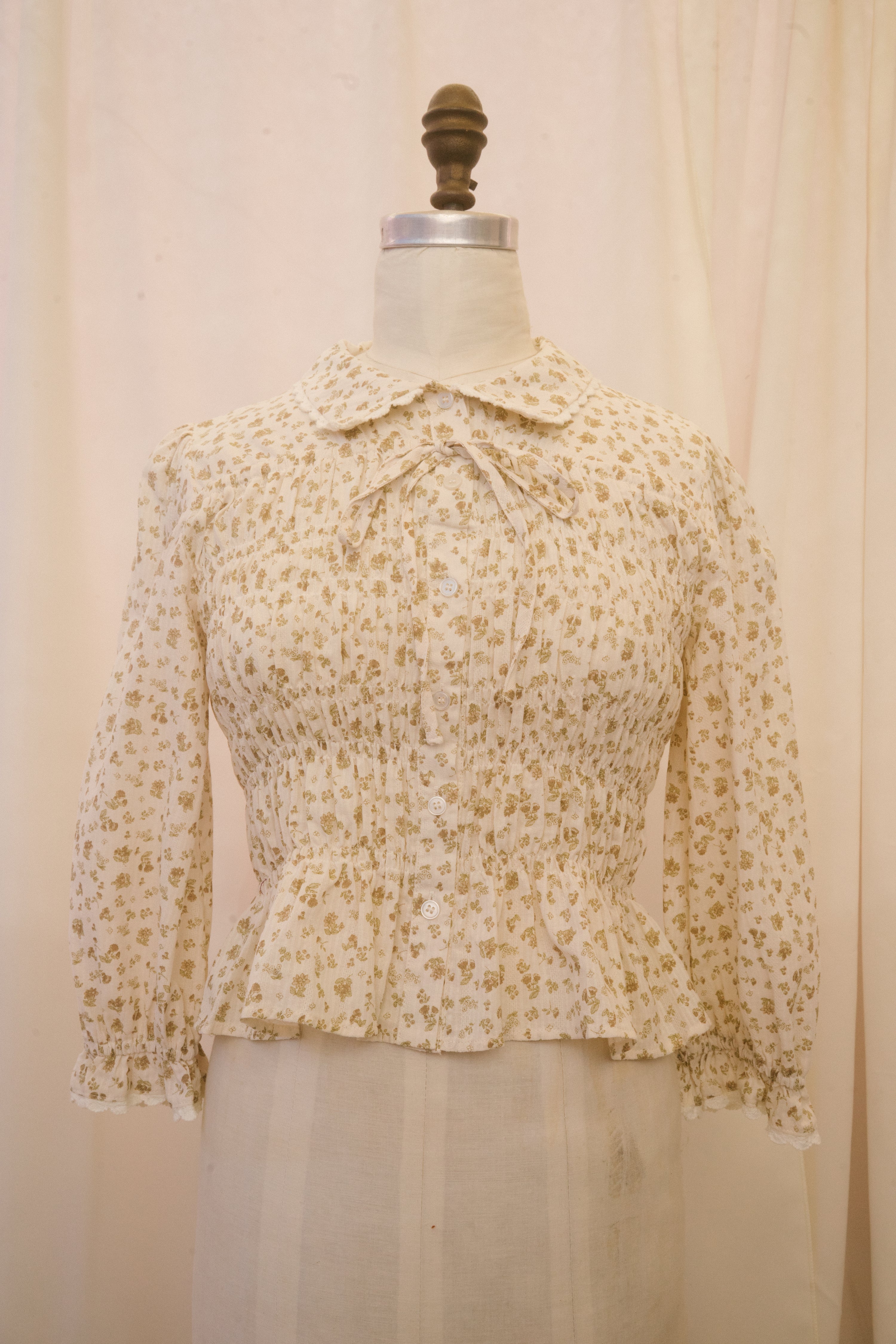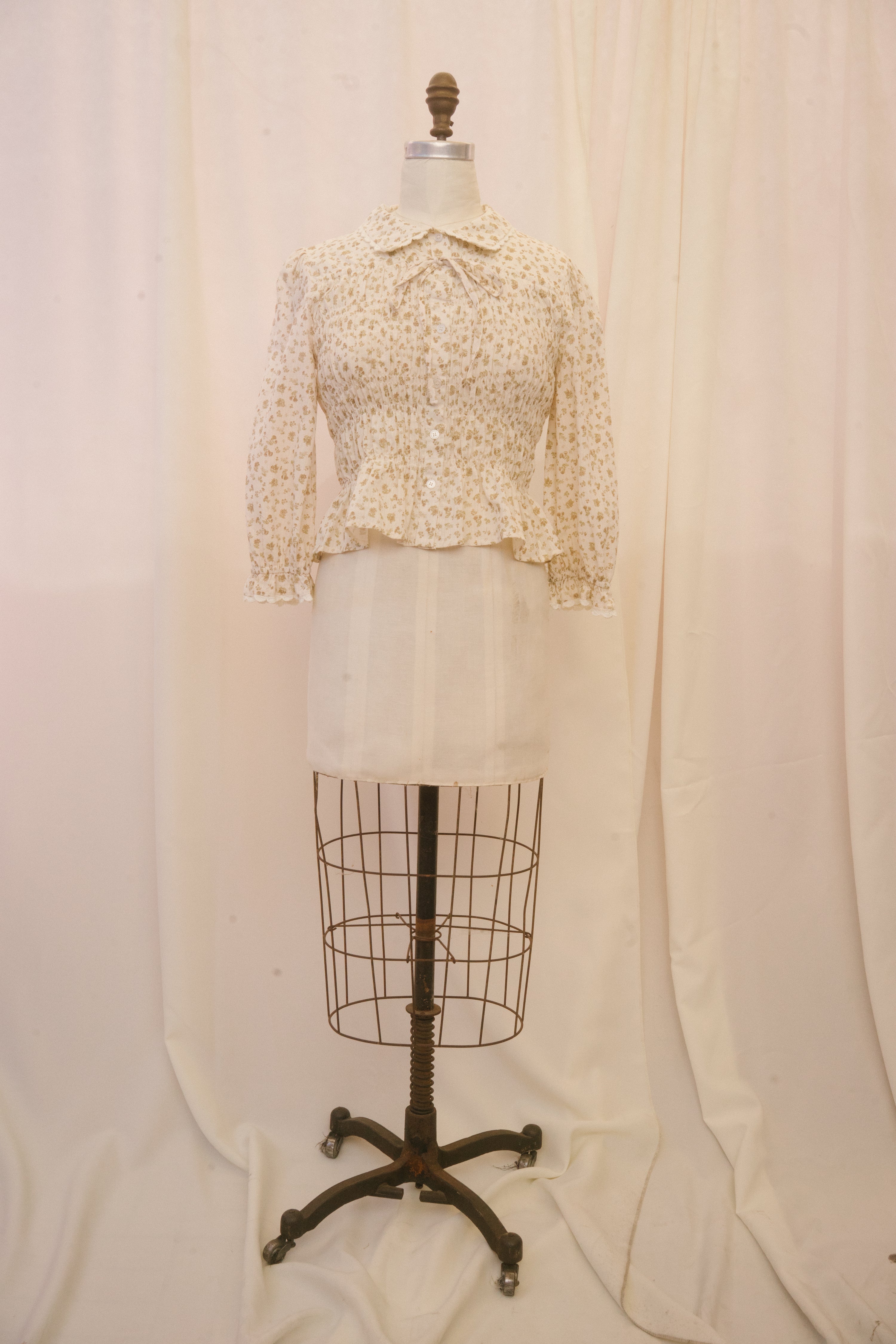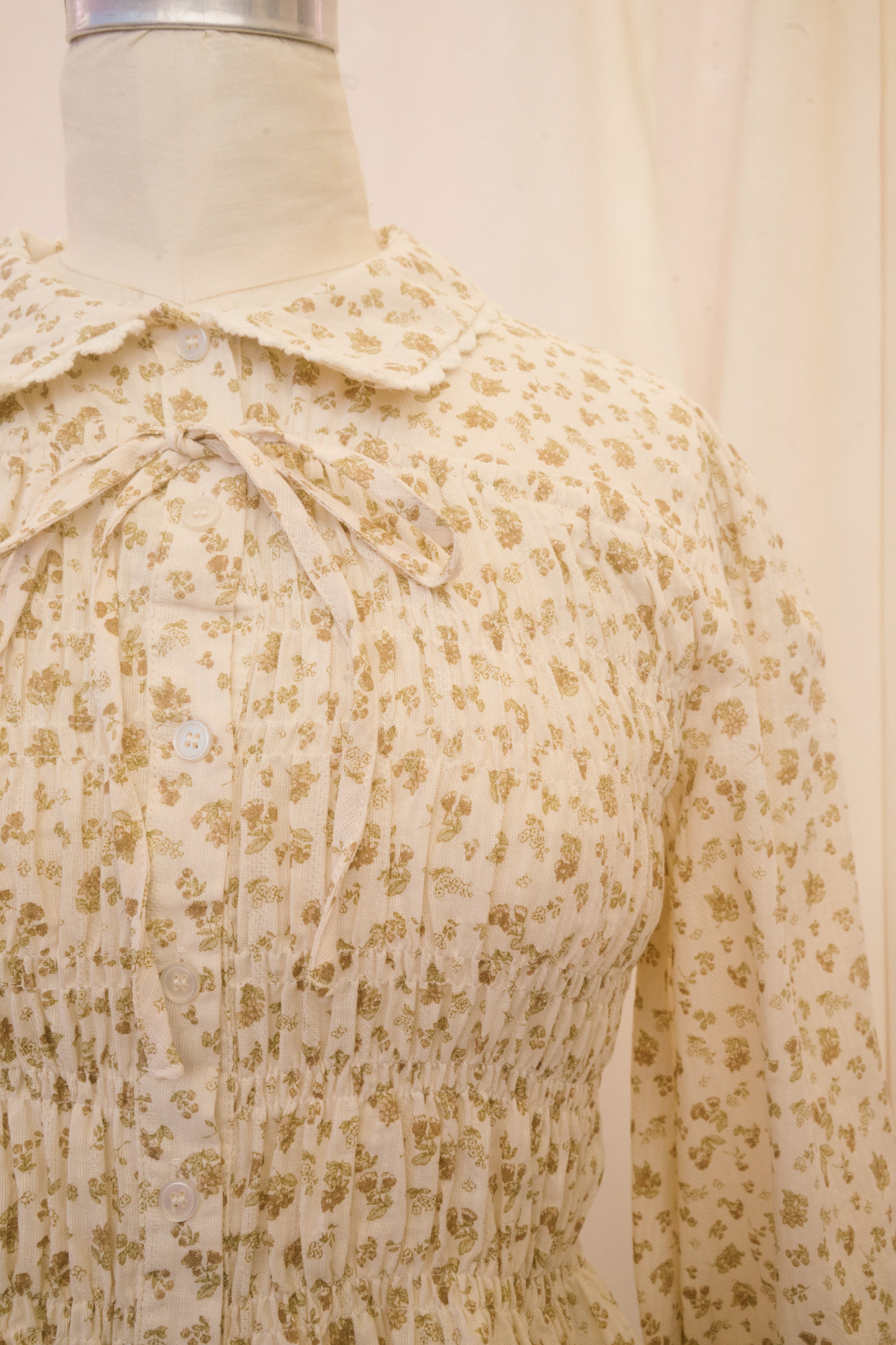 The Allegra blouse gives you buttoned-up elegance AND maxium comfort, which is why we named her "happy" in Italian! This collared blouse comes in a floaty cream fabric with brown florals printed throughout. The puffy sleeves are elasticated to hit mid-forearm and finished with cream scalloped dentelle embroidery. Five equally spaced elasticated horizontal bands give the bodice shape and structure that moves easily with you. Under the collar, which is also finished with the scalloped embroidery, hides a functional ribbon that can be tied in a pussy bow under the collar.