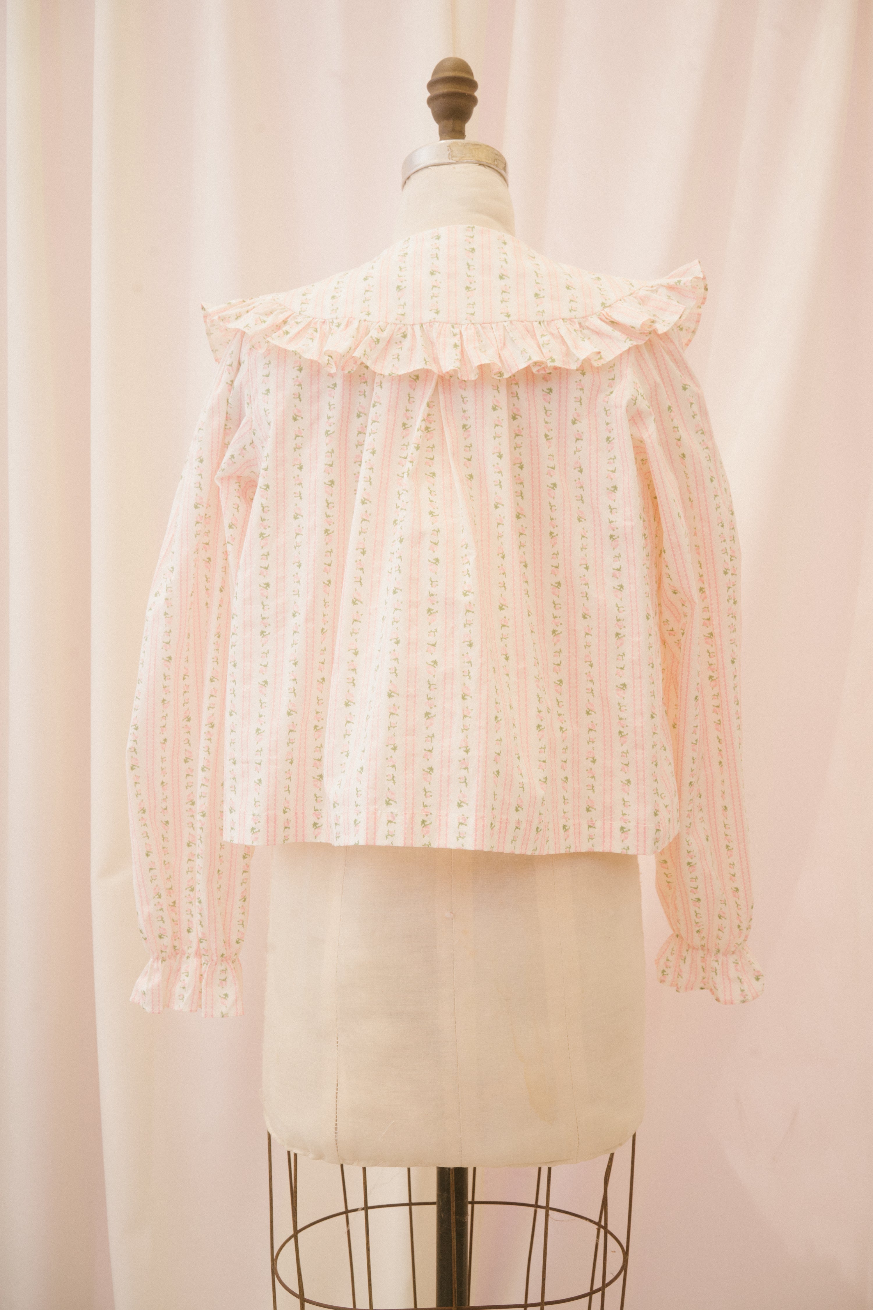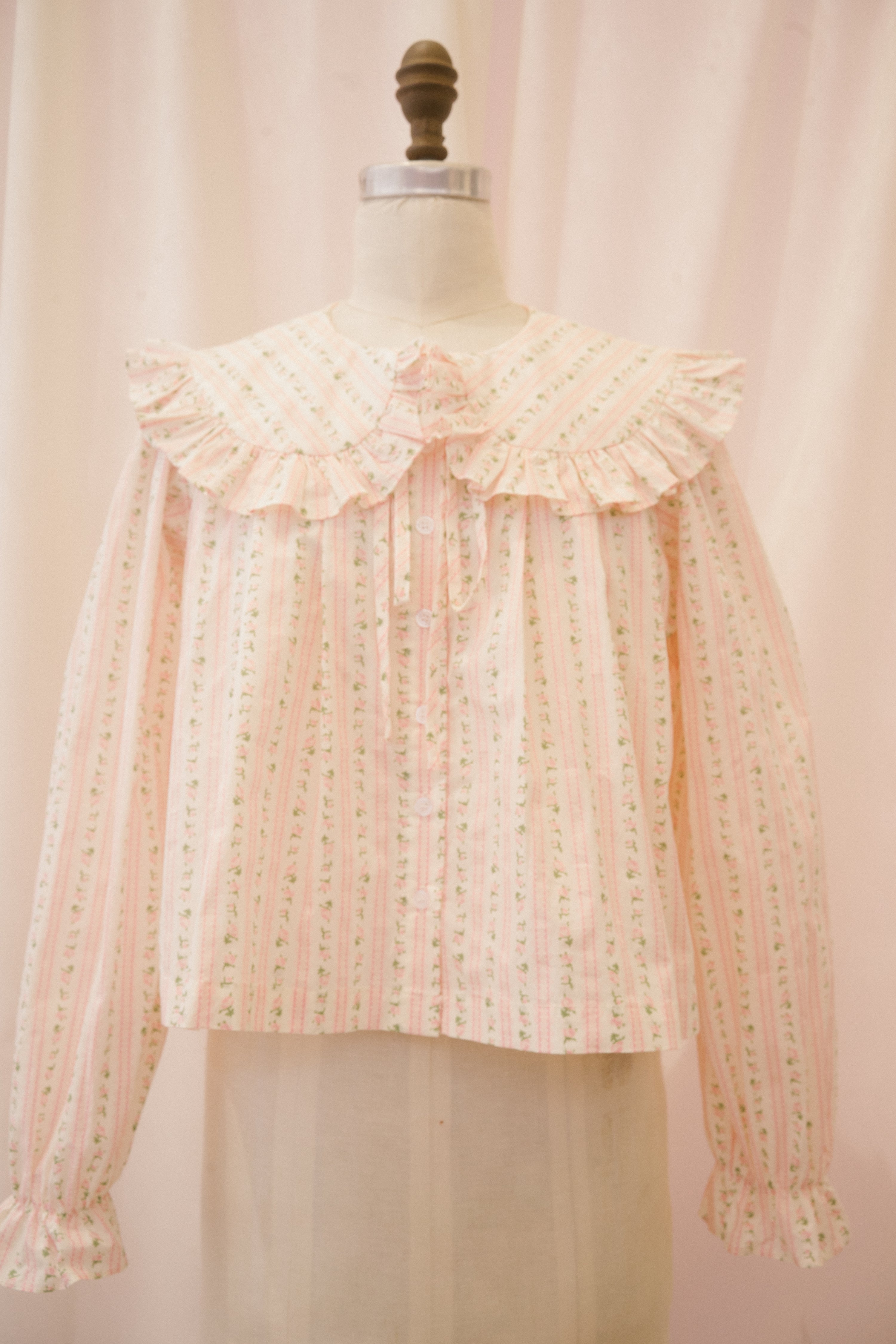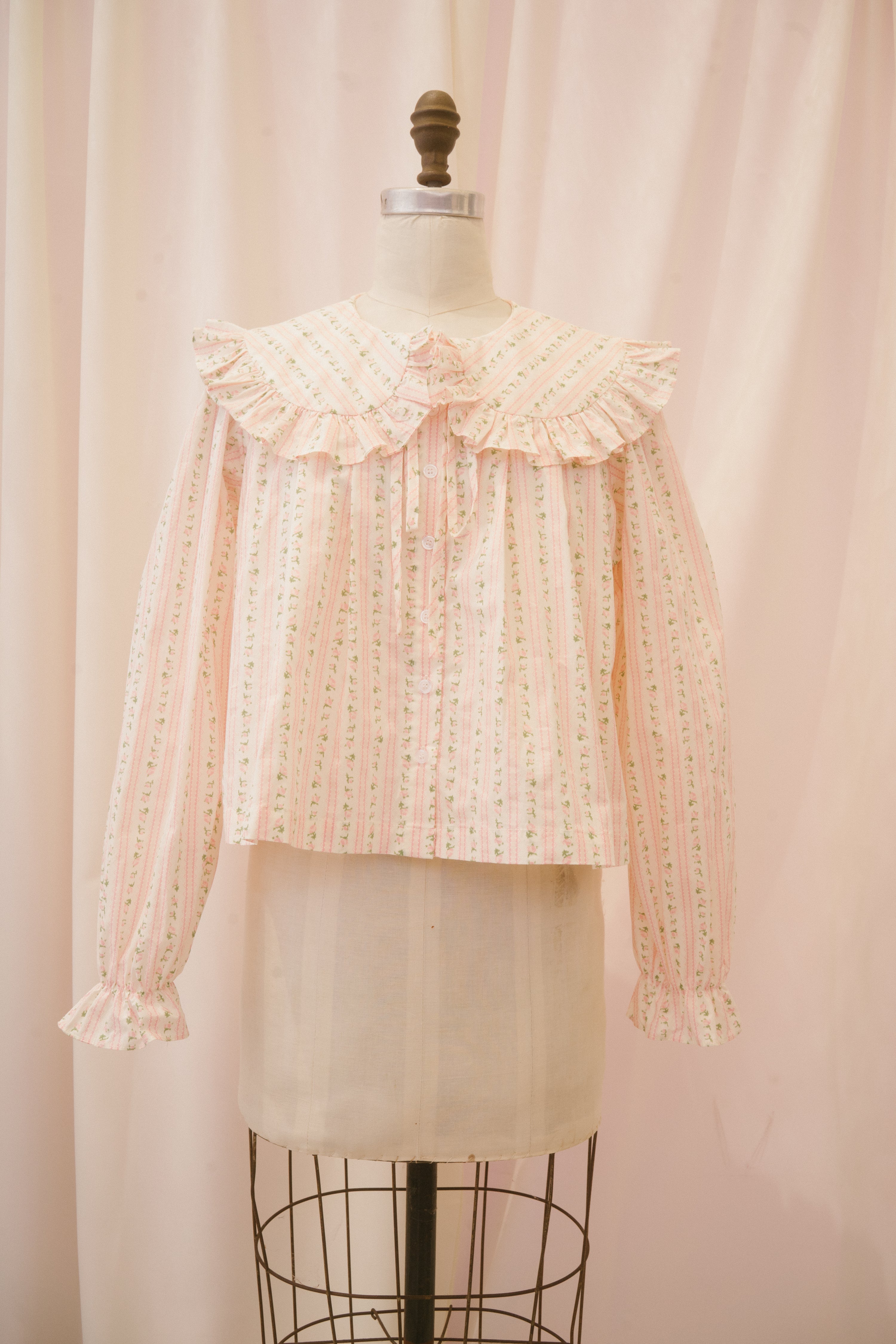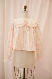 The Anglaise blouse is just begging to be worn to high tea! This structured button up blouse comes in a light white fabric with stripes of pink and green ditsy floral. The exaggerated peter pan collar features a generous ruffle, and ties at the center of the neckline with a functional ribbon. The swingy babydoll cut falls away from the body to the hip, perfect for sipping Earl Gray and nibbling on eclairs.