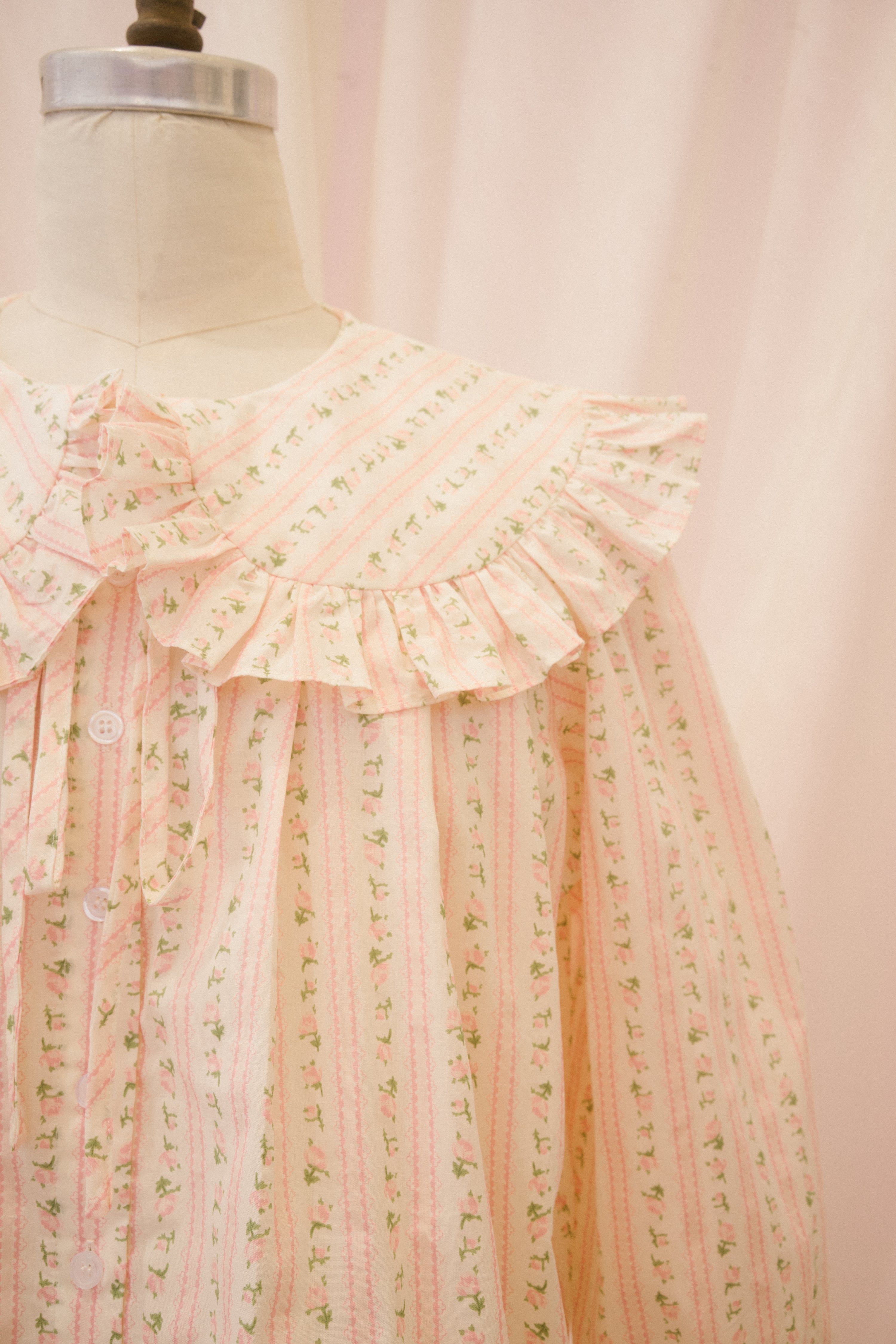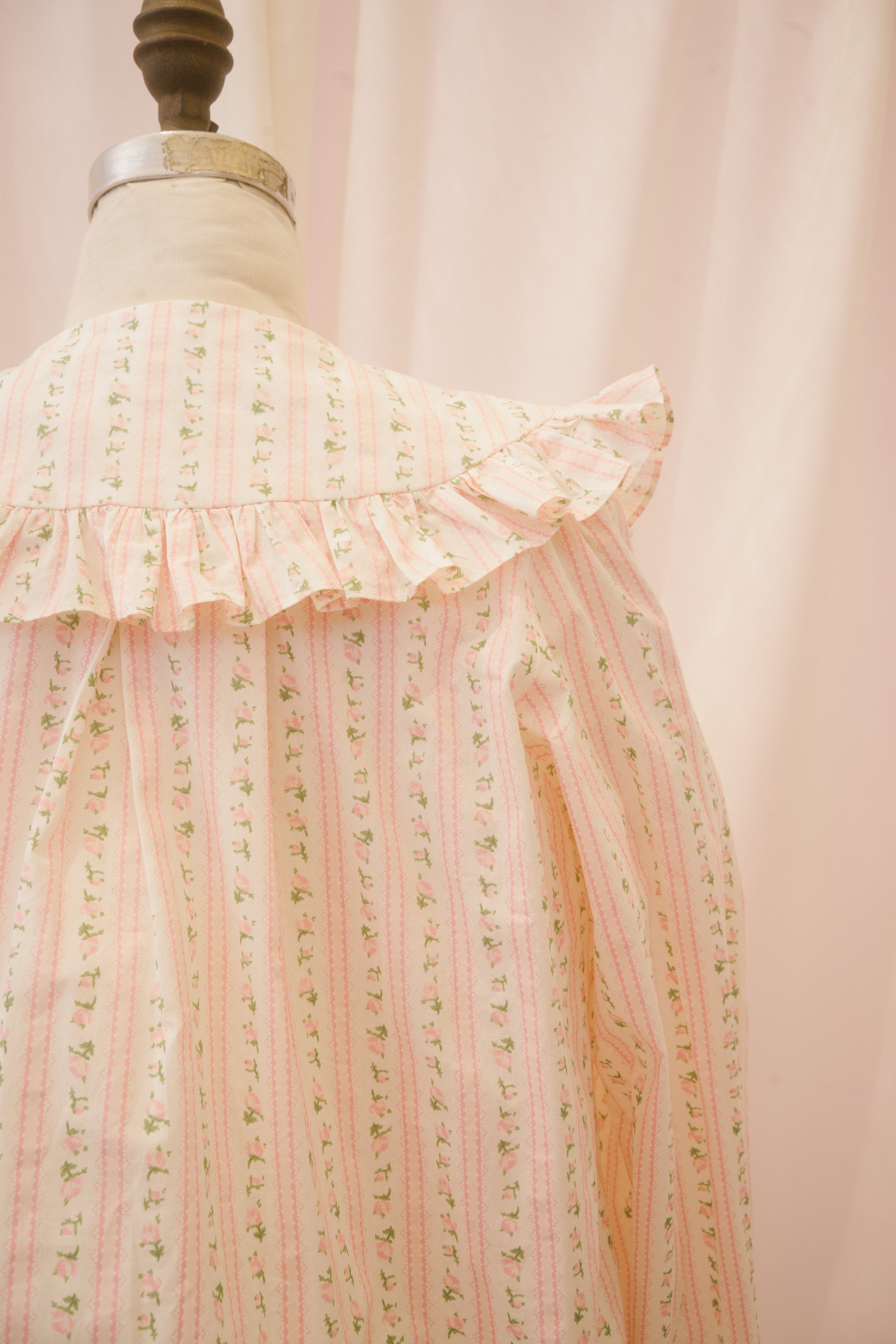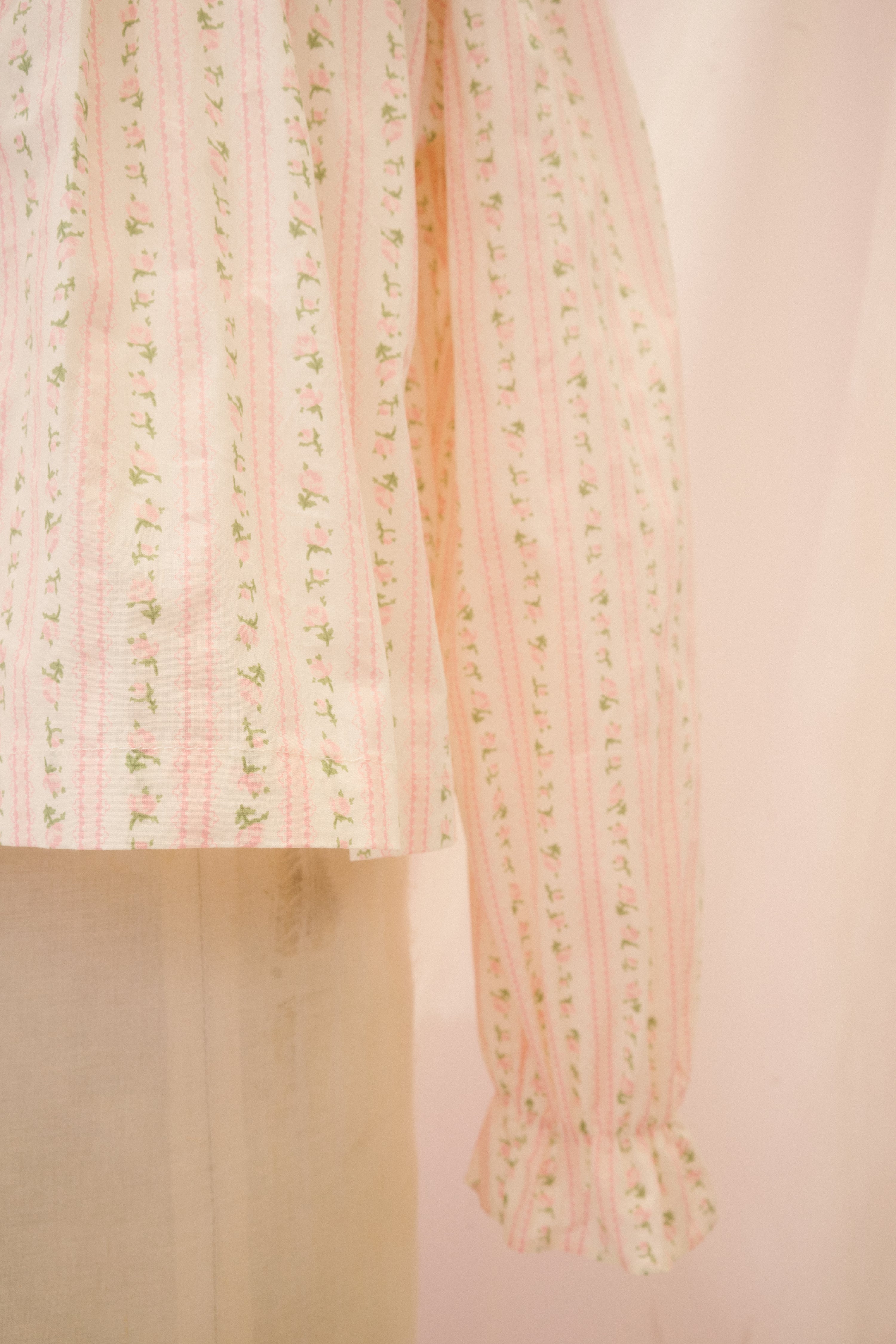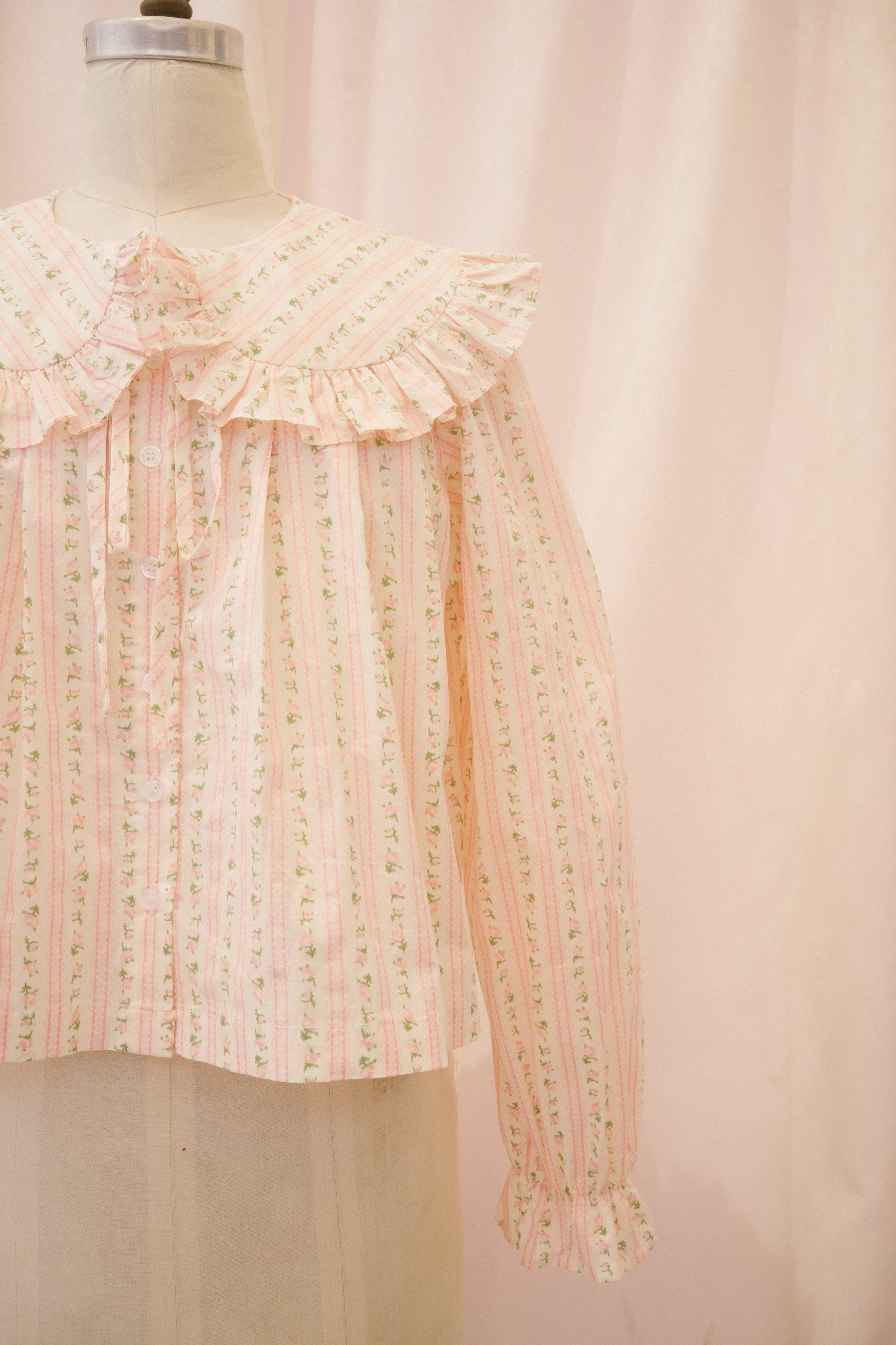 The Anglaise blouse is just begging to be worn to high tea! This structured button up blouse comes in a light white fabric with stripes of pink and green ditsy floral. The exaggerated peter pan collar features a generous ruffle, and ties at the center of the neckline with a functional ribbon. The swingy babydoll cut falls away from the body to the hip, perfect for sipping Earl Gray and nibbling on eclairs.
